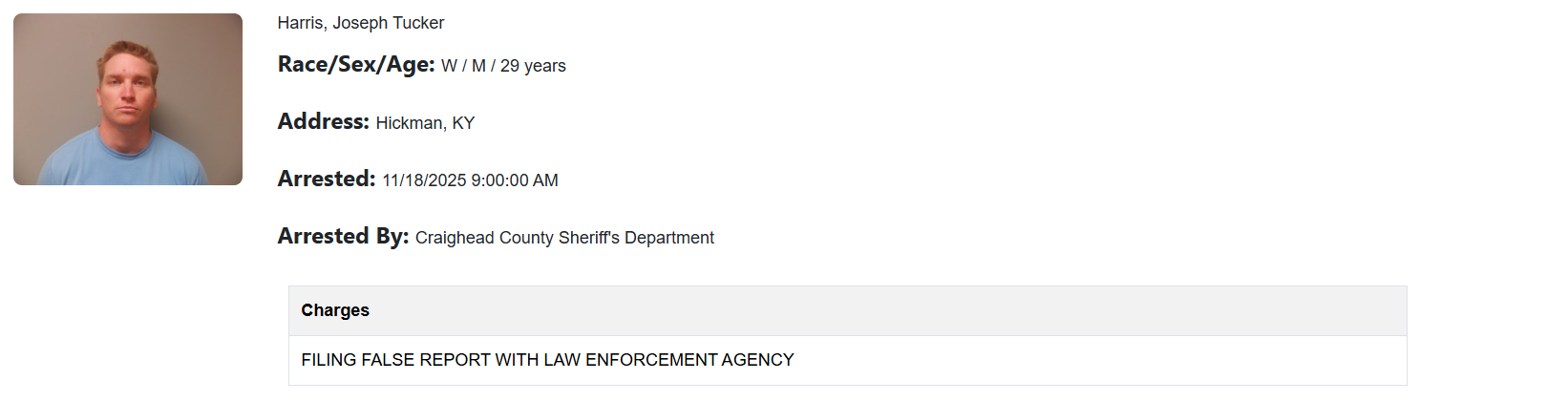 The charges stemmed from a 2024 incident in which Harris struck Craighead County Detention Center inmate Billy Lee Coram multiple times while transporting him to the jail. When the two arrived at the jail, and when Coram was under the control of jail staff, Harris attempted to strike him again, the news release said. However, the release said, these actions were not disclosed in Harris’s police report, which instead read that Coram was “transported with no further incident.”