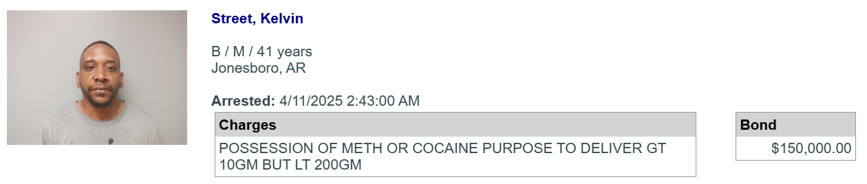 Street was evaluated by Emergency Medical Services and taken to a hospital. After he was checked out, Street was taken to the Craighead County Detention Center to be booked.