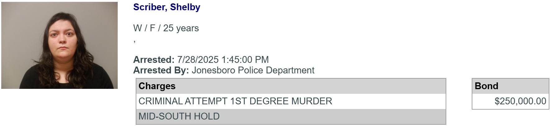 Jonesboro, AR — (JonesboroRightNow.com) — July 30, 2025 — A woman is being held on a $250,000 cash/surety bond after she was arrested in connection with a reported stabbing in Jonesboro.