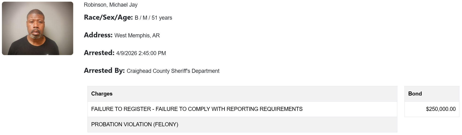 On April 6, Robinson was arrested by West Memphis police and extradited to Jonesboro. The Craighead County Sheriff’s Office jail roster shows he was booked at 2:45 p.m. on April 9.