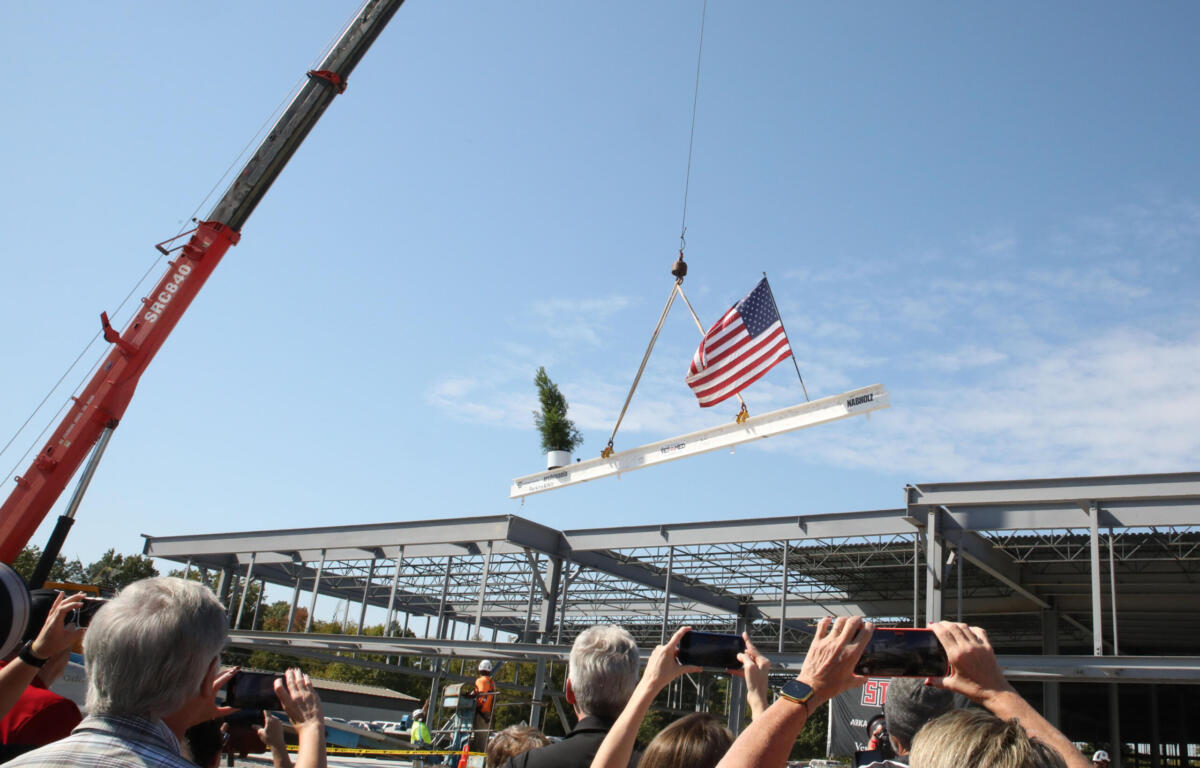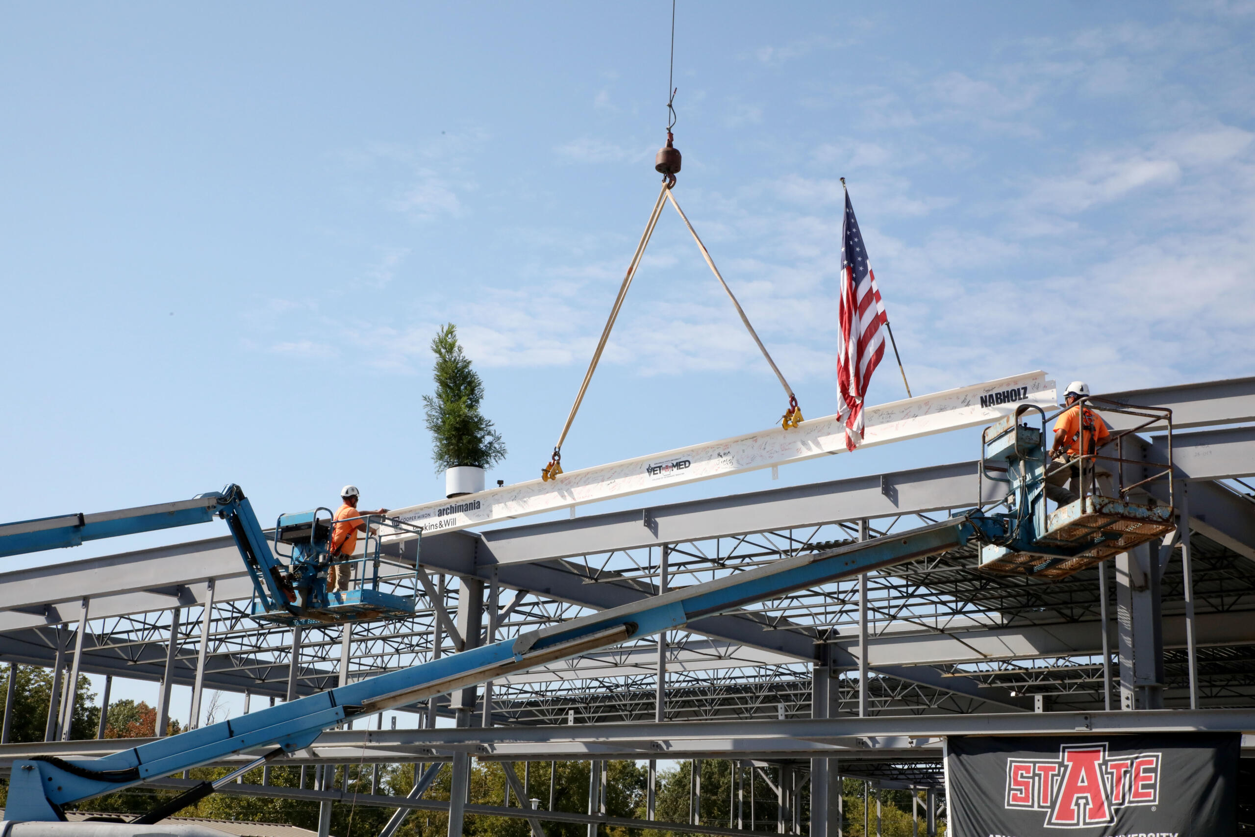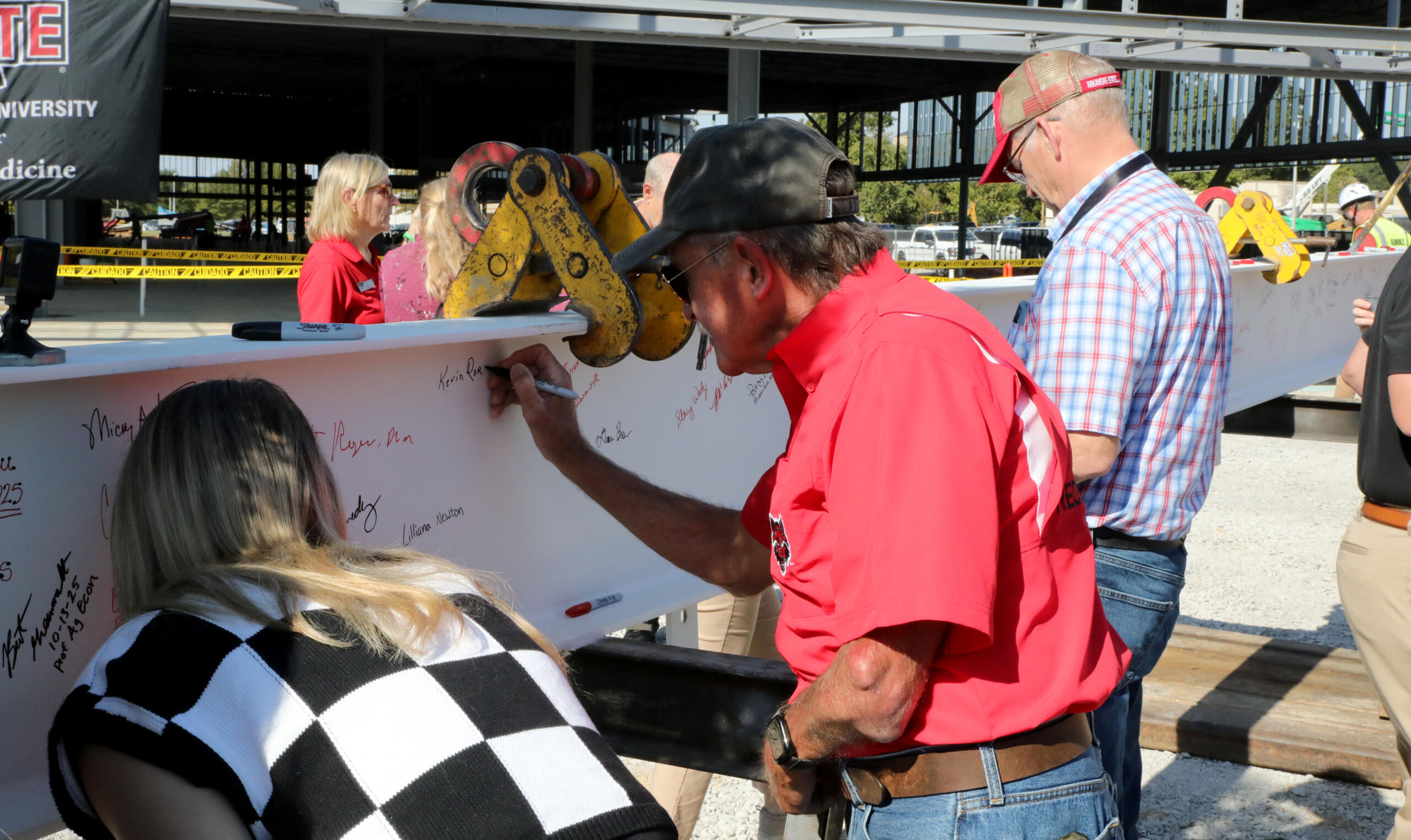 A-State and CVM leadership, contractors and local government representatives were present at the topping off ceremony, in which a building’s final beam is installed, generally signifying the structure’s completion. Those in attendance signed the beam before it was placed.