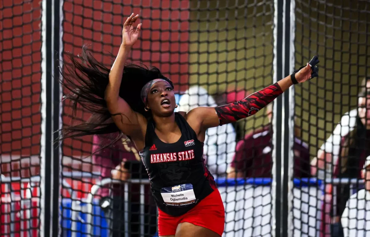 Jonesboro, AR — (Contributed) — March 13, 2025 — Arkansas State thrower Michelle Ogbemudia is set to compete for a national championship and All-American honors on Friday, as she competes in the weight throw at the NCAA Indoor Track and Field Championships in Virginia Beach, VA.