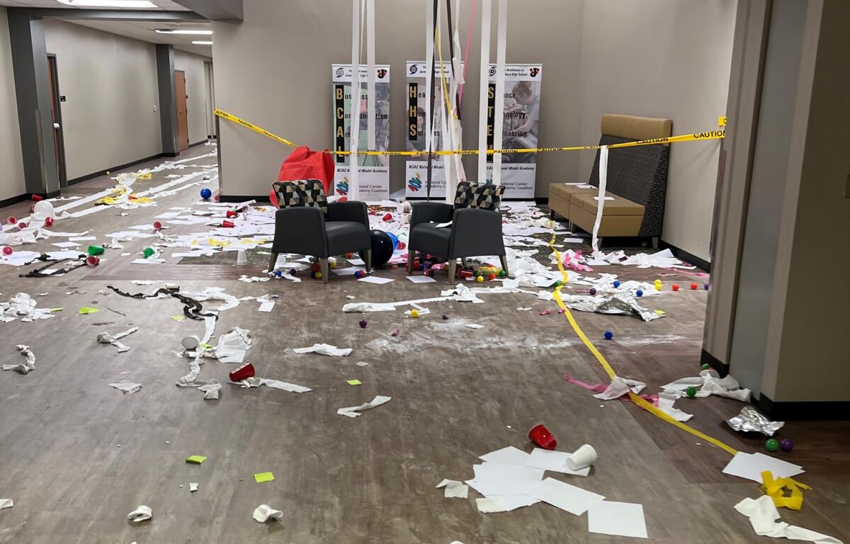 Jonesboro, AR – (JonesboroRightNow.com) – April 19, 2024 – Jonesboro Police arrested one person and issued citations to 17 others following a night of vandalism at the Academies at Jonesboro High School.  JPD Public Information Specialist Sally Smith said “the kids destroyed property in the school, it’s pretty bad.” Social media videos posted, some recorded while the vandalism was being done, indicated most, if not all, of those involved in the vandalism were high school age. Whether they were all JPS students was unclear.  Social media has referenced the vandalism as a “senior prank” that is “done every year.” Smith called what happened inside the school “unacceptable vandalism.”