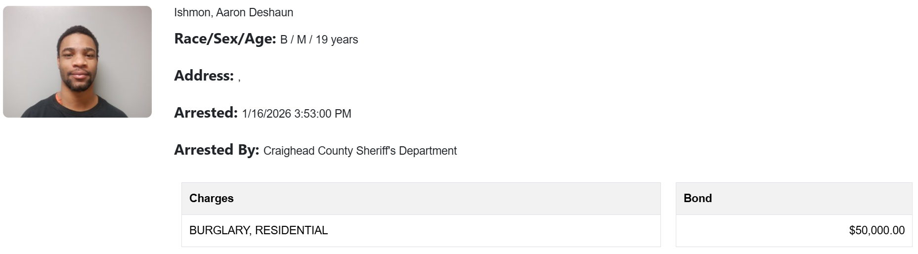 A warrant was later issued for Ishmon. He was later found in White County and arrested. He was then extradited to the Craighead County Detention Center and booked in at 3:53 p.m., Jan. 16.