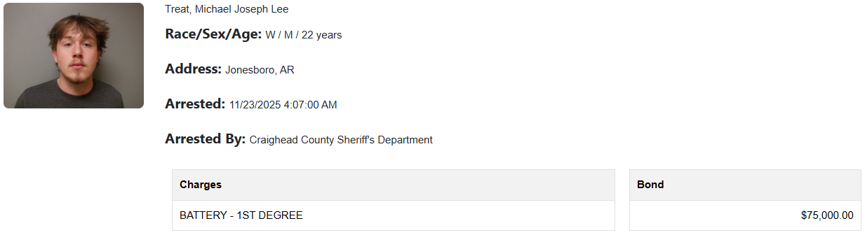 According to an affidavit, on Nov. 23, Craighead County deputies were called to a home in the 2600 block of Craighead 712 Road for a shooting. After arriving, they were told an argument had occurred between 22-year-old Michael Joseph Lee Treat and the victim. The argument was, apparently, about Treat leaving the victim at Brickhouse Grill.