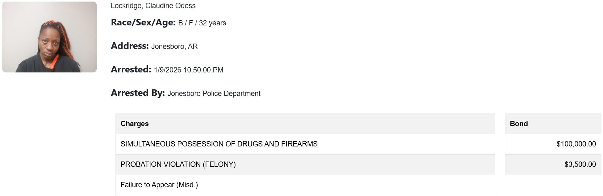 According to the affidavit, on Jan. 9, Jonesboro police officer James Johnson learned Lockridge had a felony warrant for her arrest and was staying at the Super 8 Motel. After confirming which room she was staying in, the officer made contact with Lockridge and arrested her. Police later found she was listed as a probation absconder.