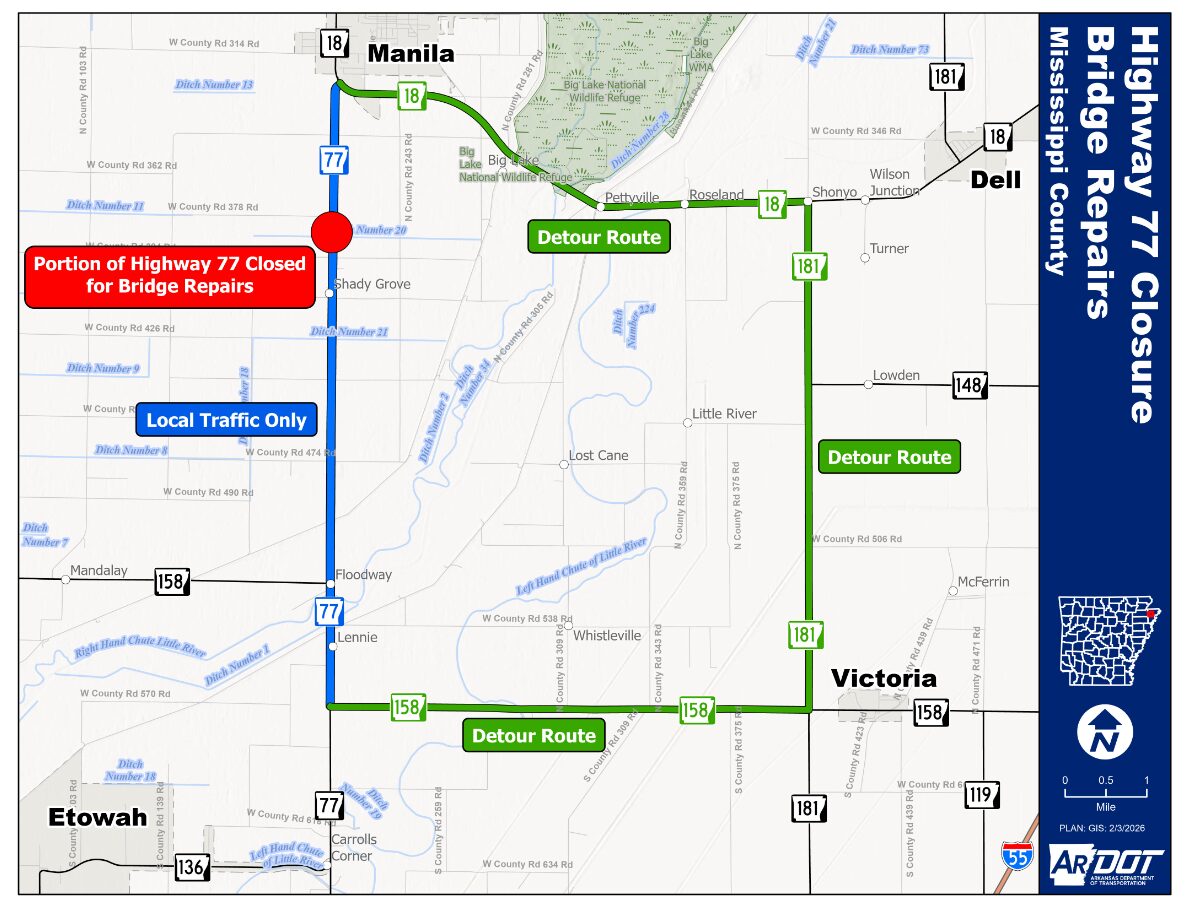 According to the Arkansas Department of Transportation (ARDOT), a detour will be in place with signage marking the route. Northbound traffic will use Highway 158 east to Highway 181 to Highway 18 west and back to Highway 77. Southbound traffic will reverse the route, using Highways 18 to 181 to 158 before returning to Highway 77.
