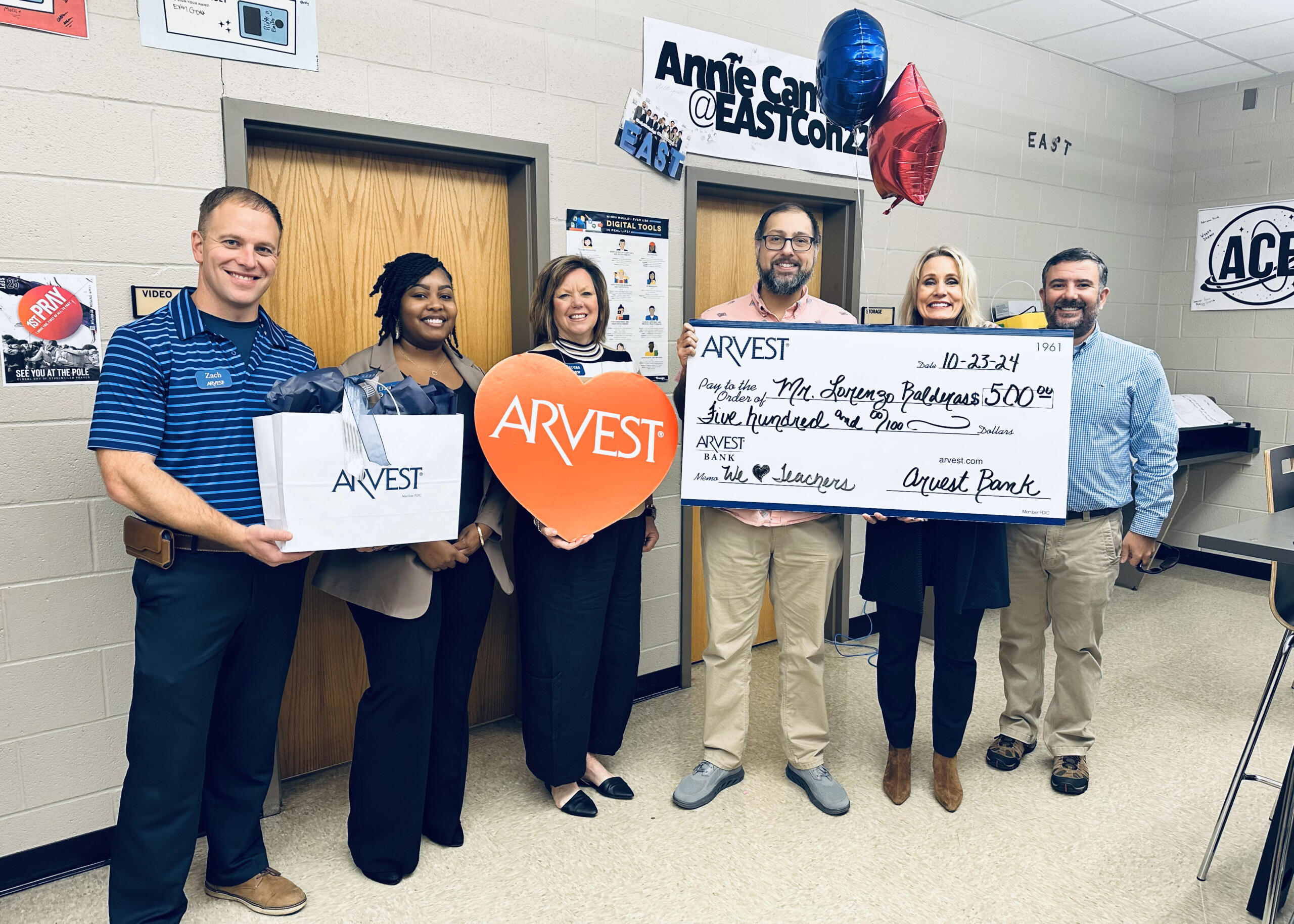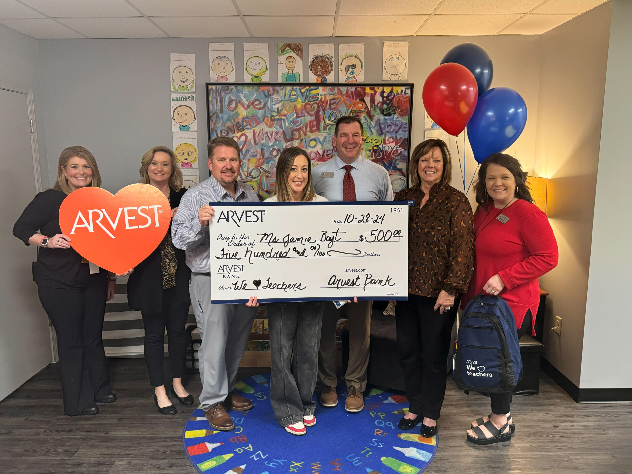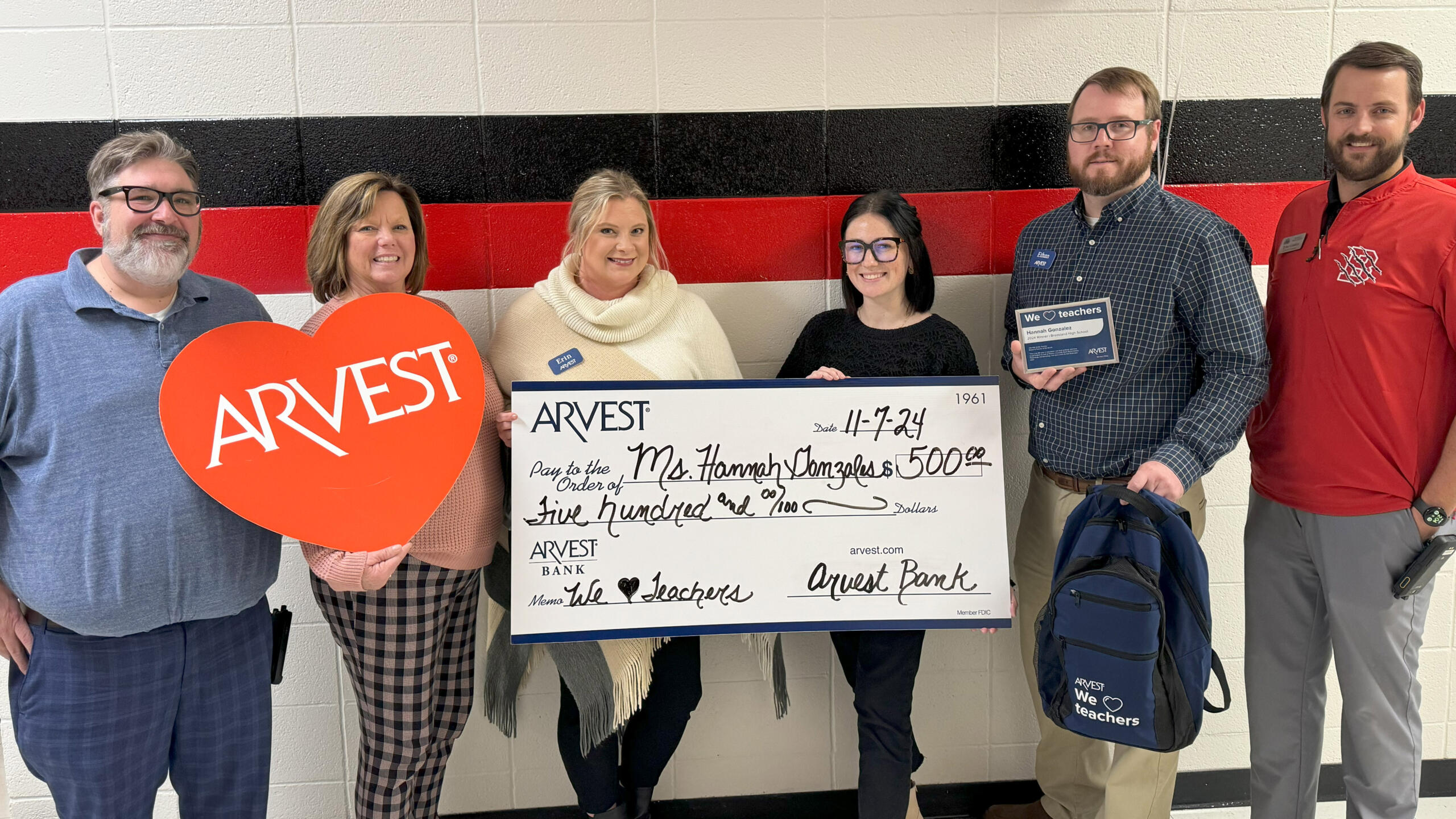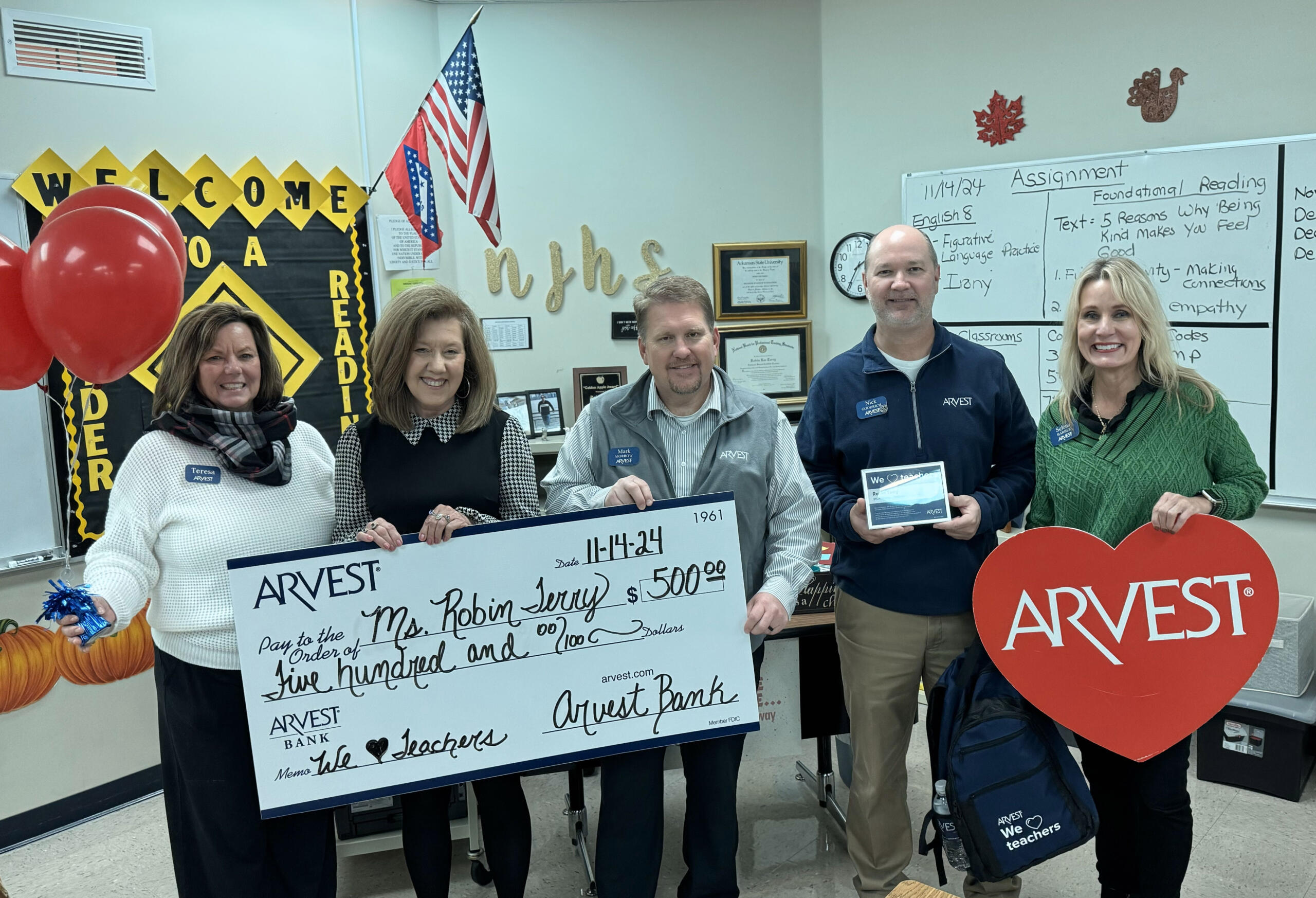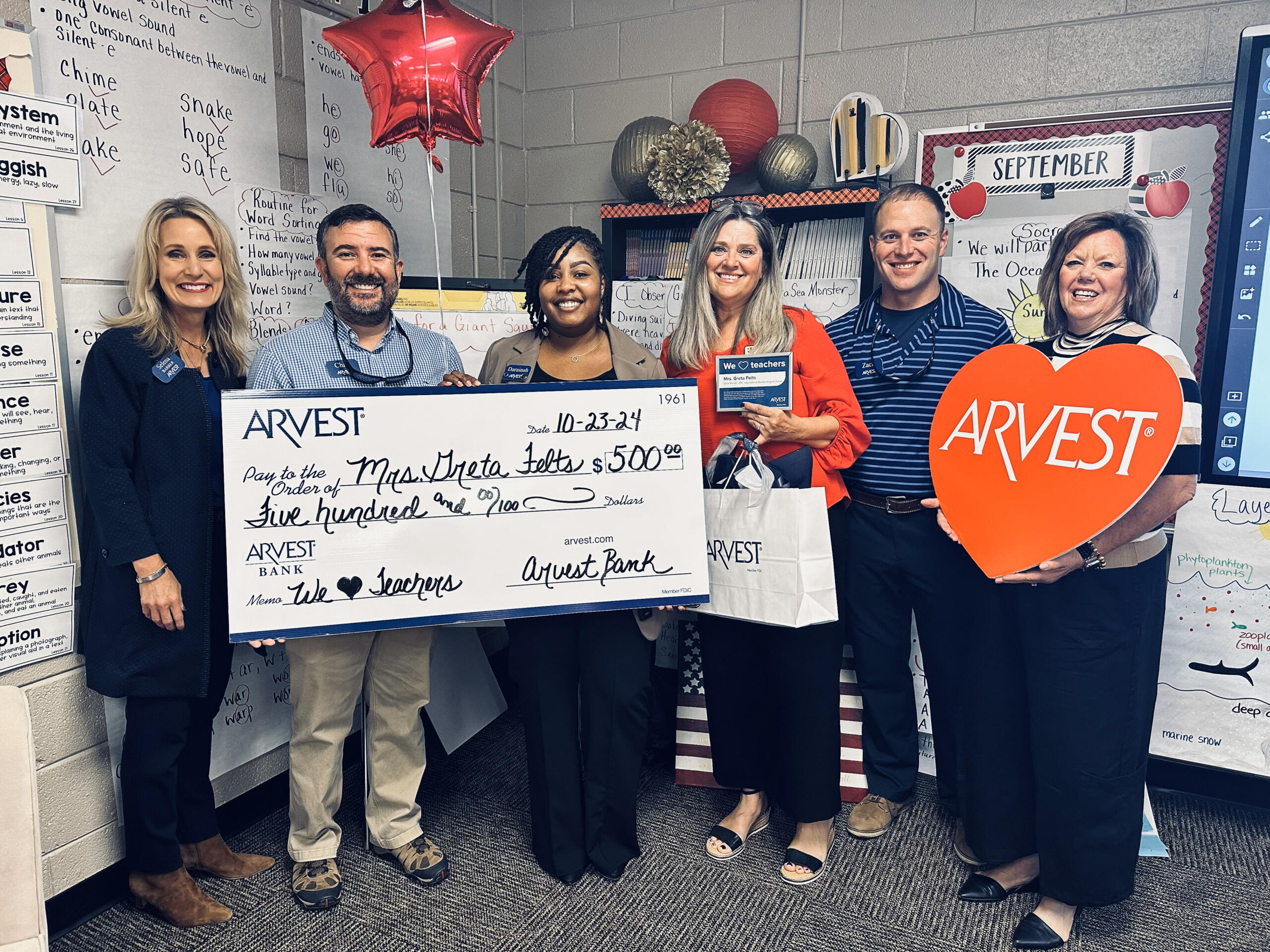 Jonesboro, AR – (JonesboroRightNow.com) – Nov. 18, 2024 – Arvest Bank recently honored six local teachers during the bank’s annual “We Love Teachers” initiative, which awards area educators $500 each to help with the purchase of school supplies.