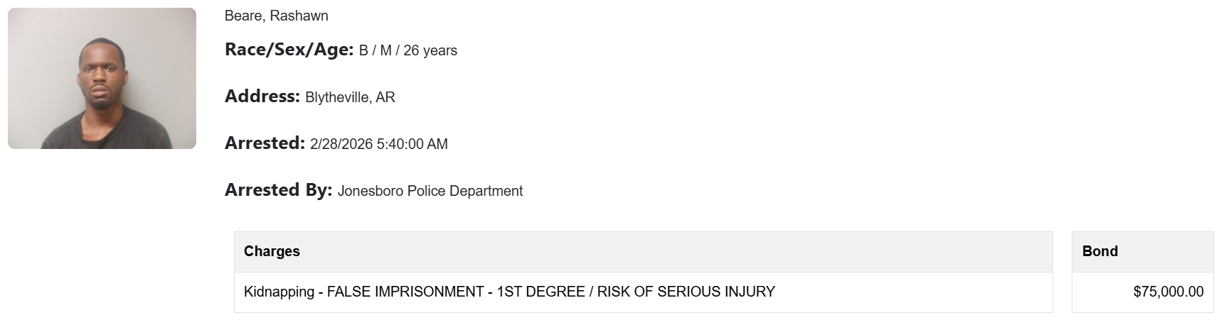 Beare was taken to the Craighead County Detention Center. Upon arrival, he attempted to escape from the patrol vehicle but was quickly apprehended.