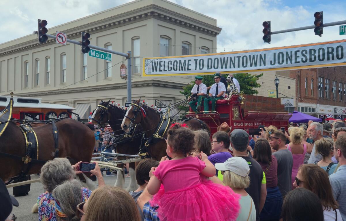 Jonesboro, AR — (JonesboroRightNow.com) — June 14, 2025 — The hot temperatures didn’t stop people from coming to downtown Jonesboro Saturday to see the legendary Budweiser Clydesdales.