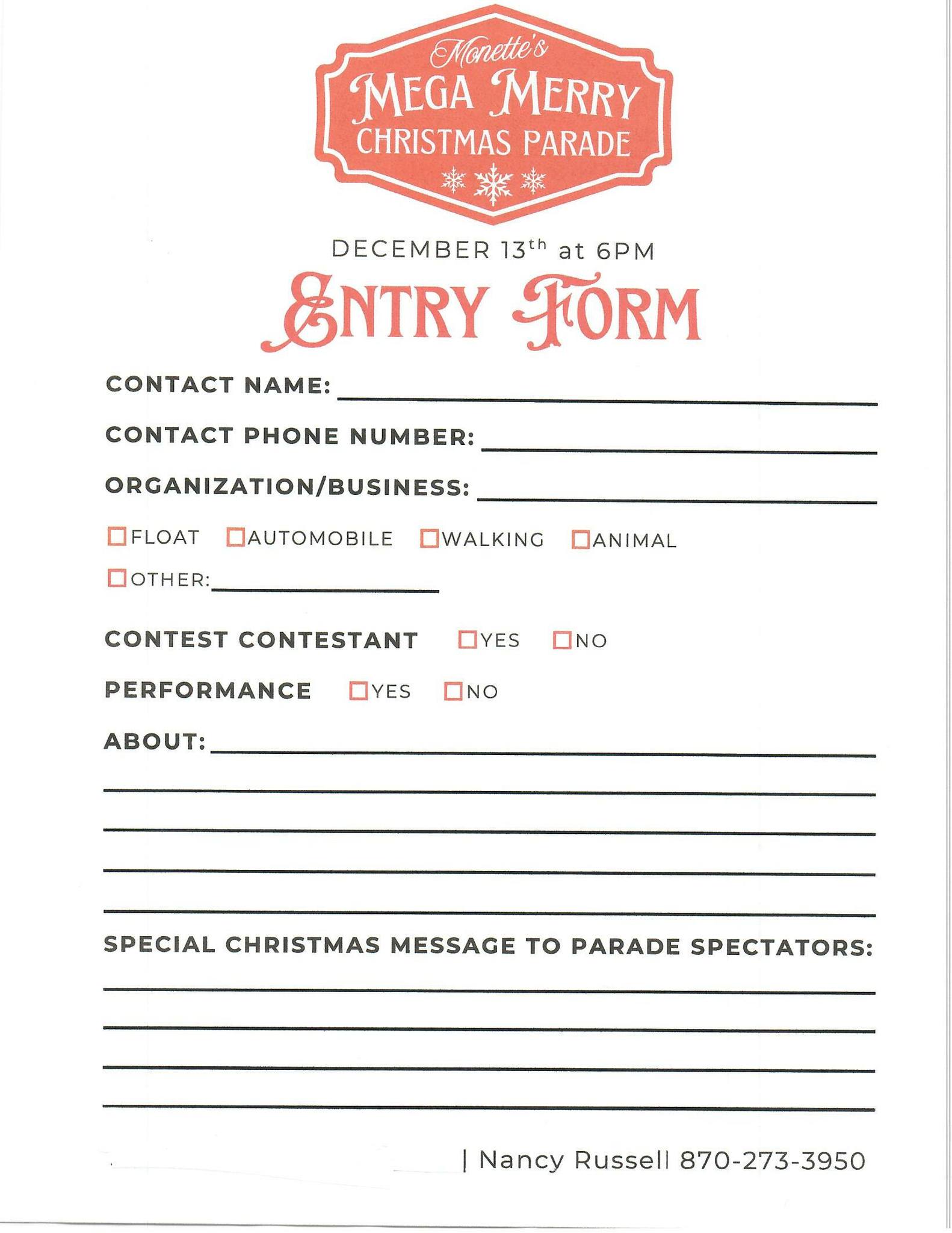 - Details: This parade will feature floats, performances, and more. It will be livestreamed on Facebook. Those wanting to enter the parade need to fill out the entry form and either return it to Monette City Hall or email it to monettechristmasparade@gmail.com. More information here.