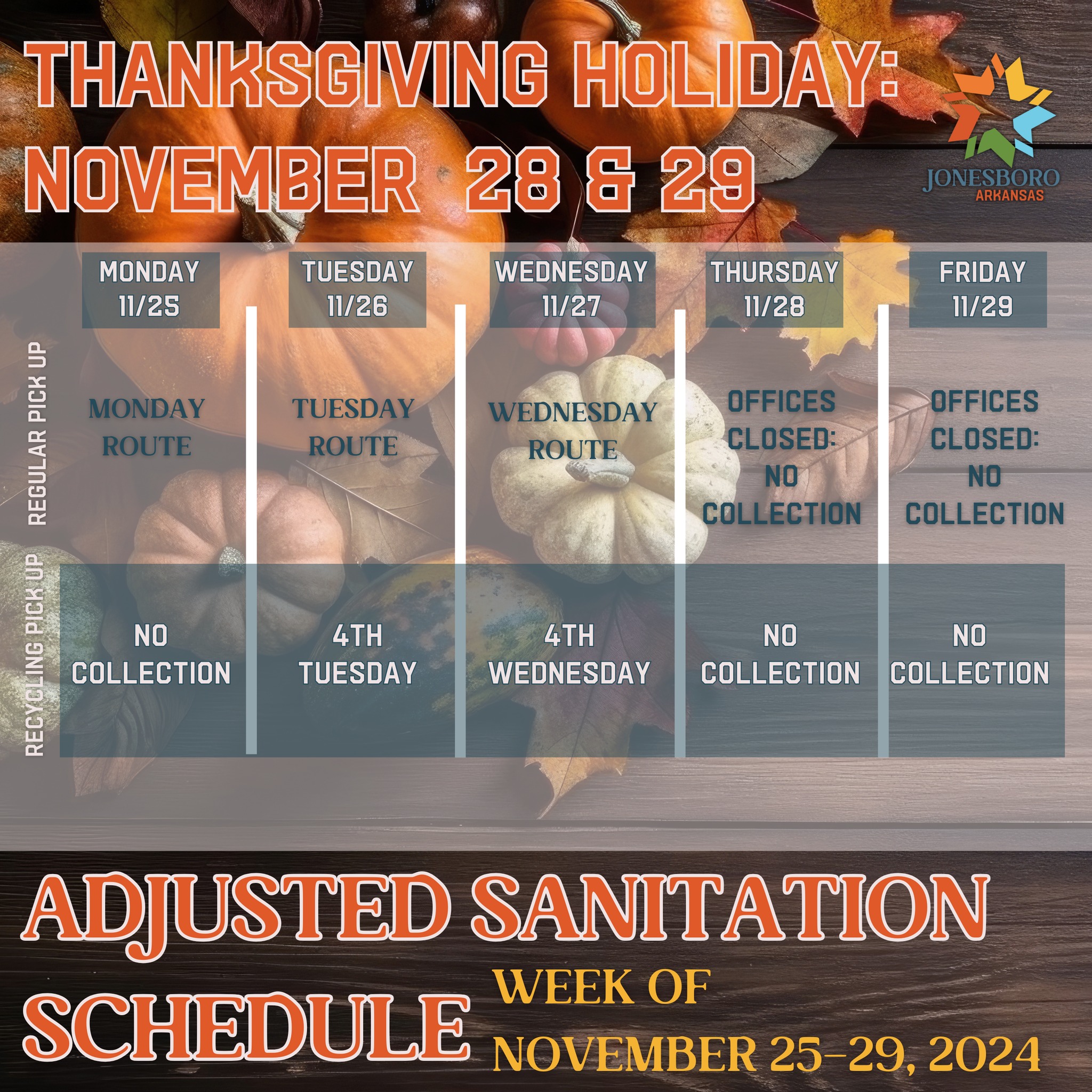 During the week of Nov. 25 – Nov. 29, sanitation routes will continue as planned on Monday-Wednesday, however, there will be no collection Thursday and Friday. This is because offices for the City of Jonesboro will be closed Thursday and Friday in observance of Thanksgiving.