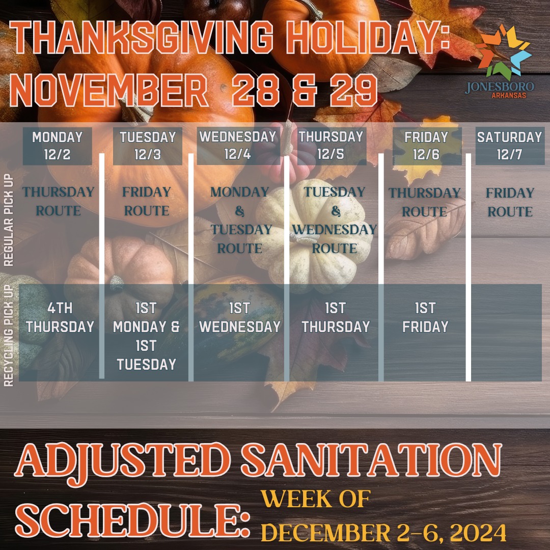 Jonesboro, AR – (JonesboroRightNow.com) – Nov. 25, 2024 – Sanitation routes for the City of Jonesboro will be adjusted due to the upcoming Thanksgiving holiday.