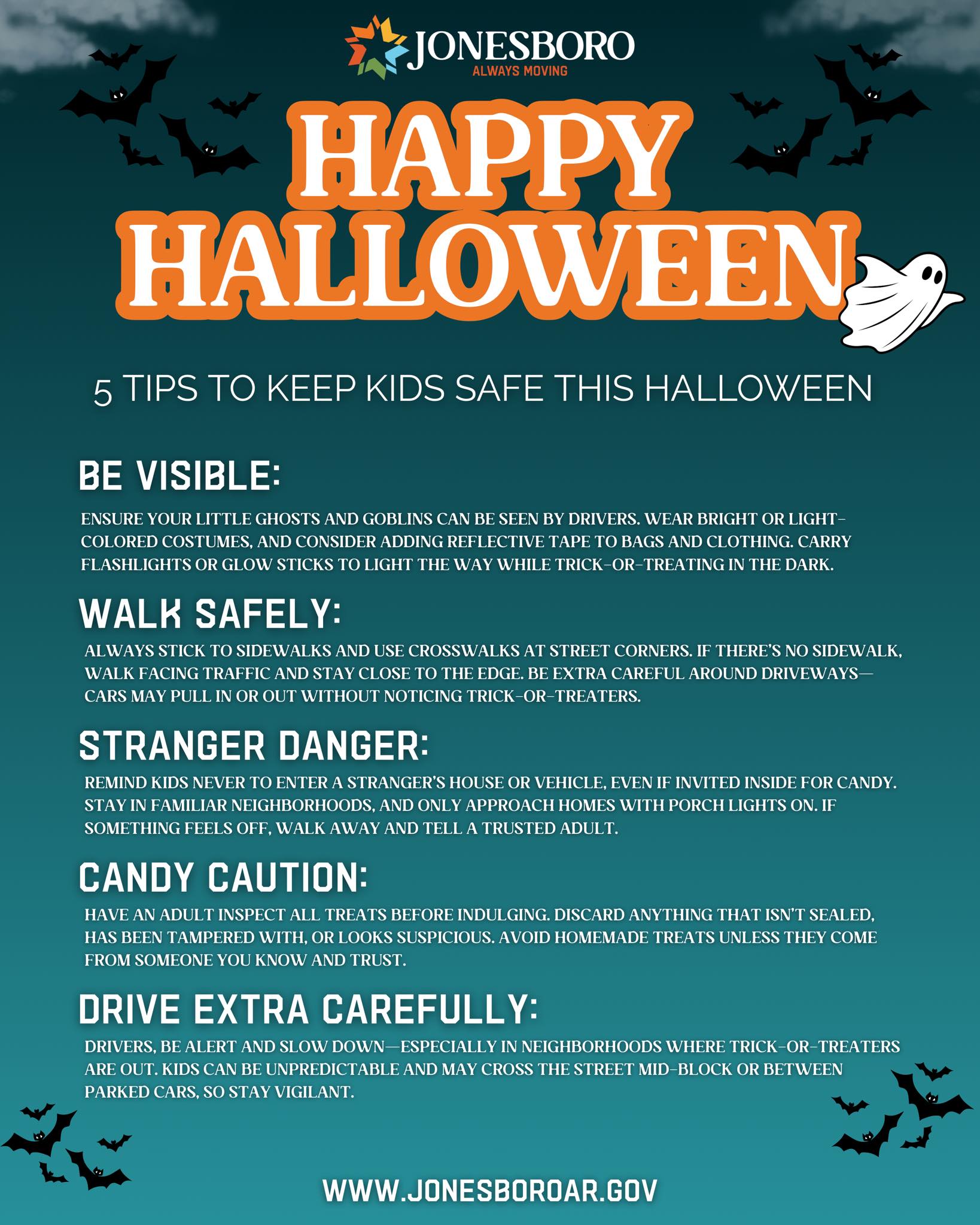 Jonesboro, AR – (JonesboroRightNow.com) – With many kids set to trick-or-treat tonight, the City of Jonesboro provided some safety tips for both parents/guardians and children.
