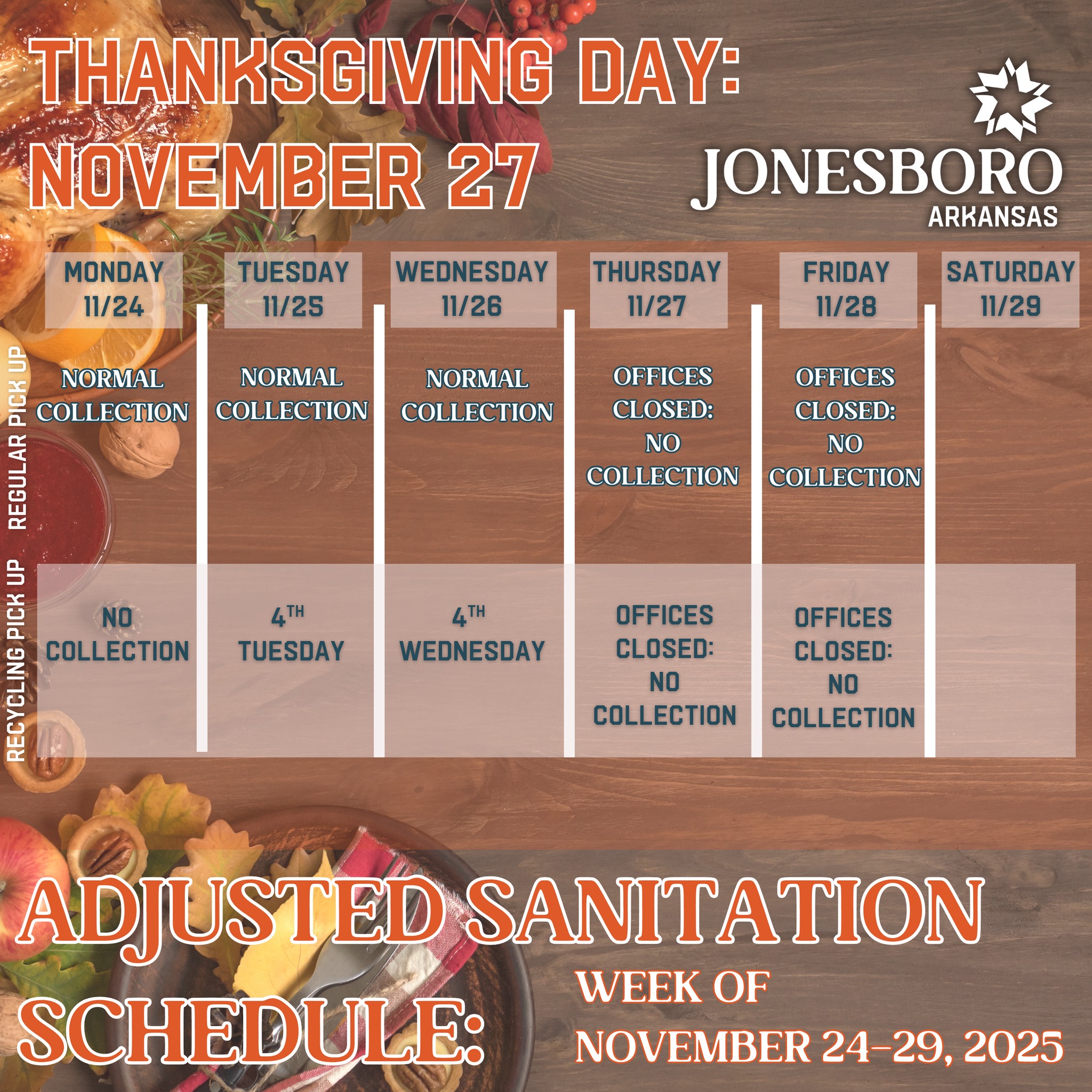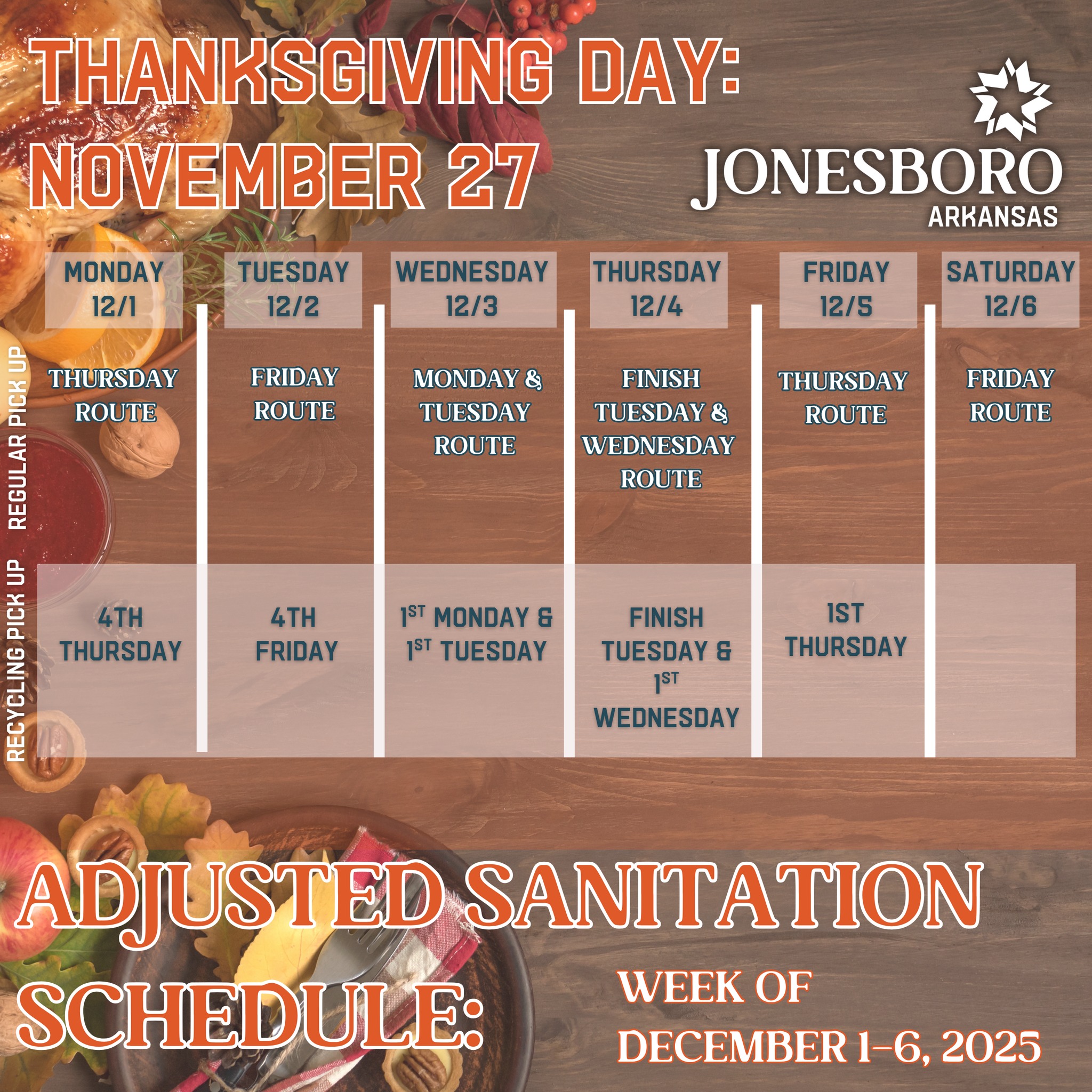 Jonesboro, AR – (JonesboroRightNow.com) – Due to the upcoming Thanksgiving holiday, Jonesboro sanitation routes will be on adjusted schedules the weeks of Nov. 24-29 and Dec. 1-6.