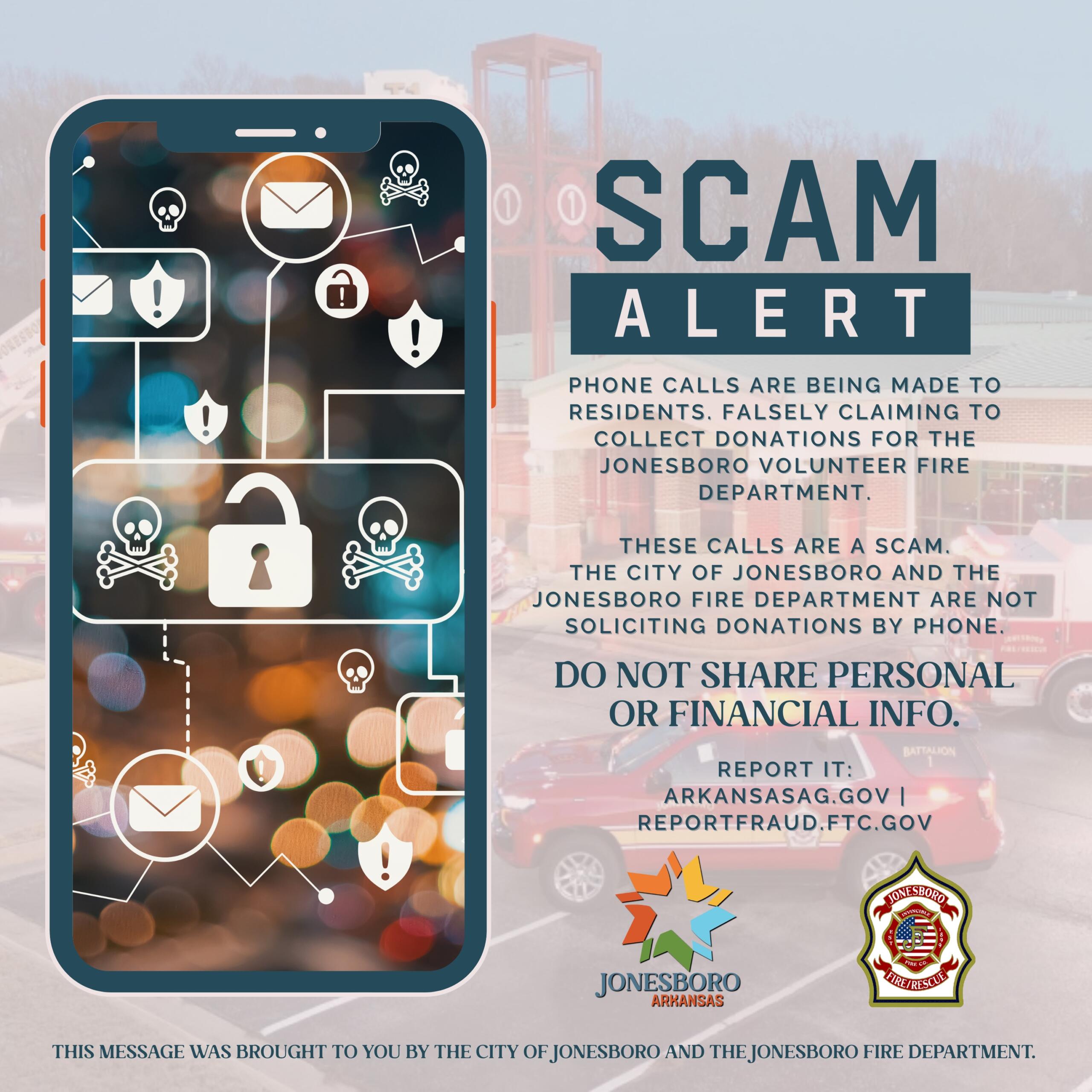 “We’ve been made aware of phone calls being made to Jonesboro residents requesting donations for the ‘Jonesboro Volunteer Fire Department.’ These calls are a scam,” the city said in a Monday news release. “The City of Jonesboro and the Jonesboro Fire Department are NOT making any fundraising phone calls.”