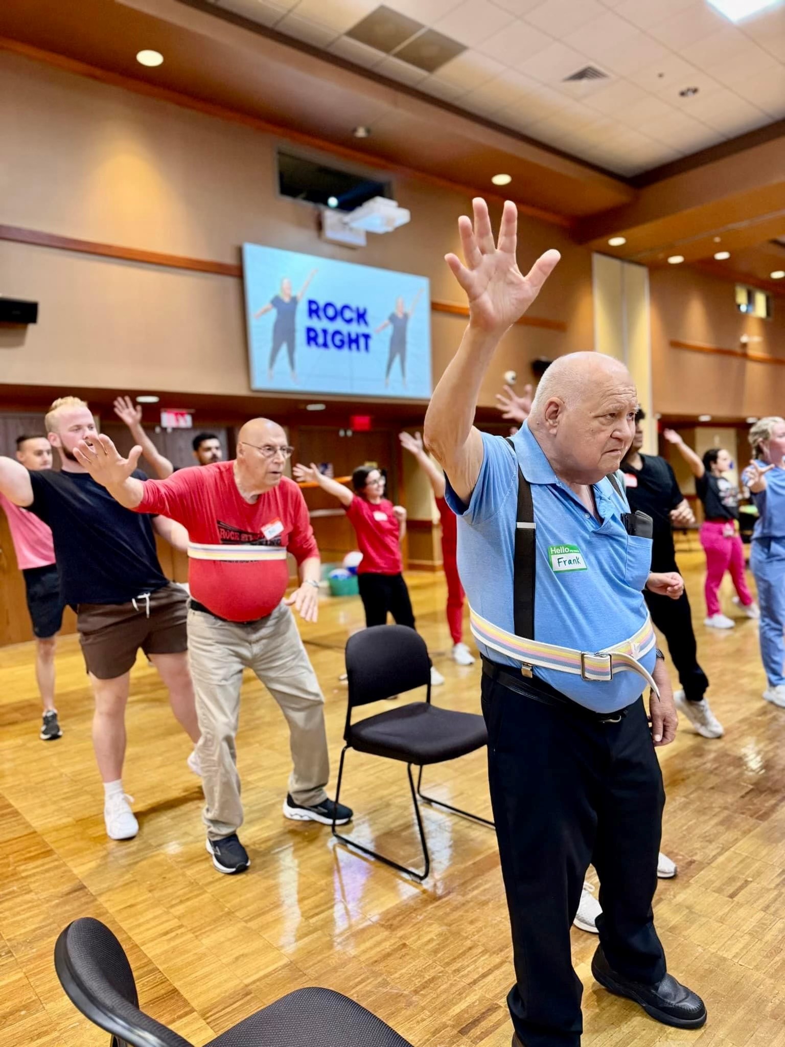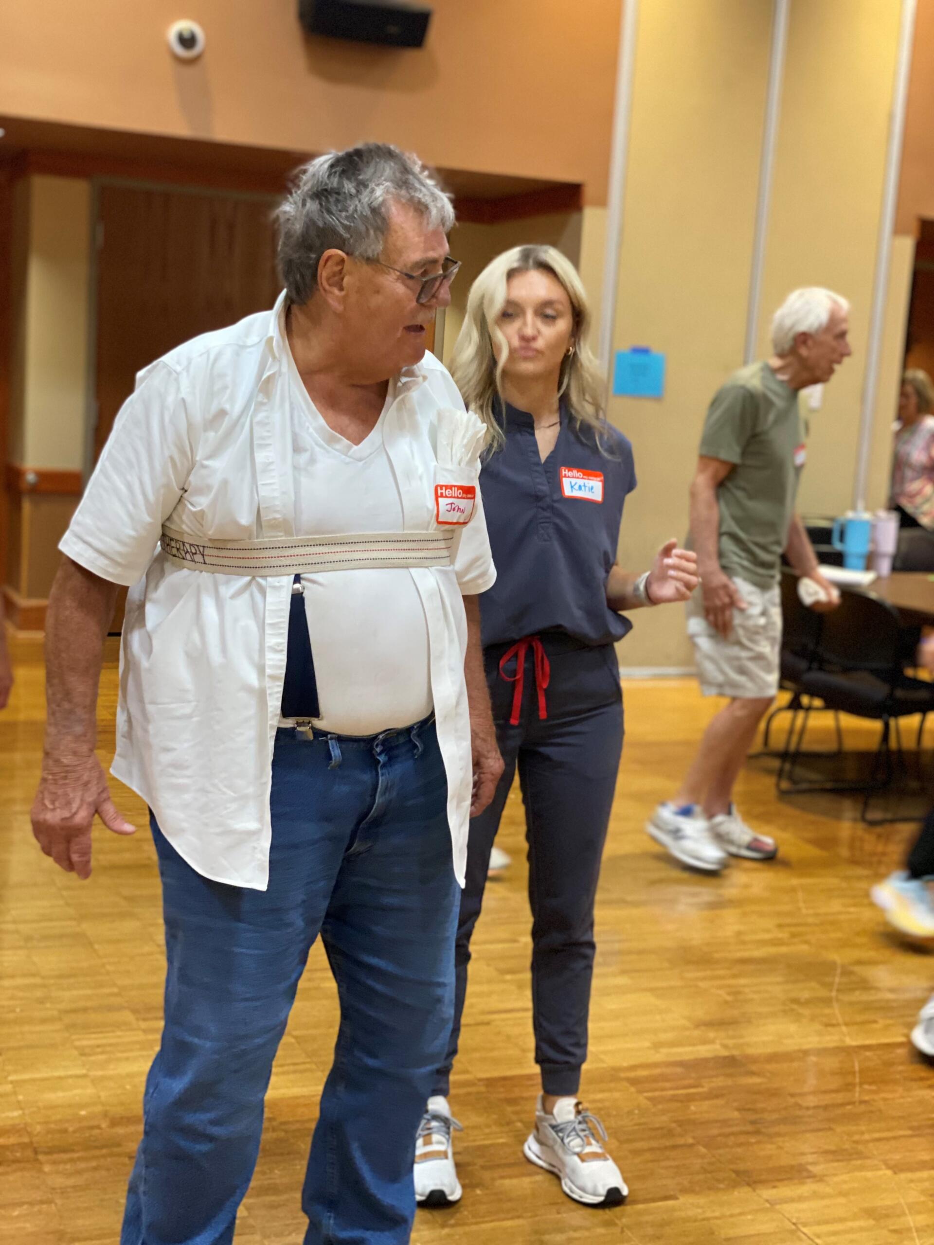 Participants went through various circuits focusing on fine motor skills, balance, activities of daily living (ADLs), gait, floor recovery, and Parkinson’s-specific exercises. These exercises emphasized posture, weight shifting in multiple directions, trunk rotation, and stepping strategies, all aimed at improving movement quality and reducing fall risk. While the primary focus was on physical improvement, the underlying goal was to ensure everyone had fun together.