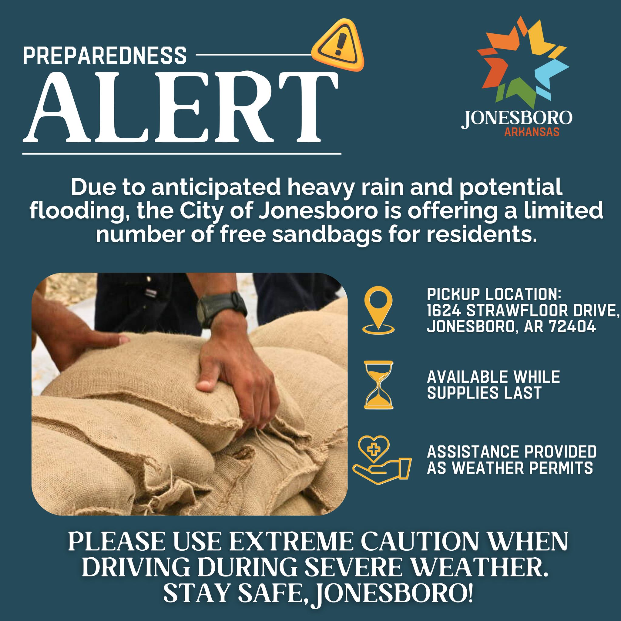 Additionally, the City of Jonesboro posted on its official Facebook page that it was offering free sandbags for residents due to anticipated heavy rain and flooding. Jonesboro residents are limited to 20 bags, and they are available while supplies last.