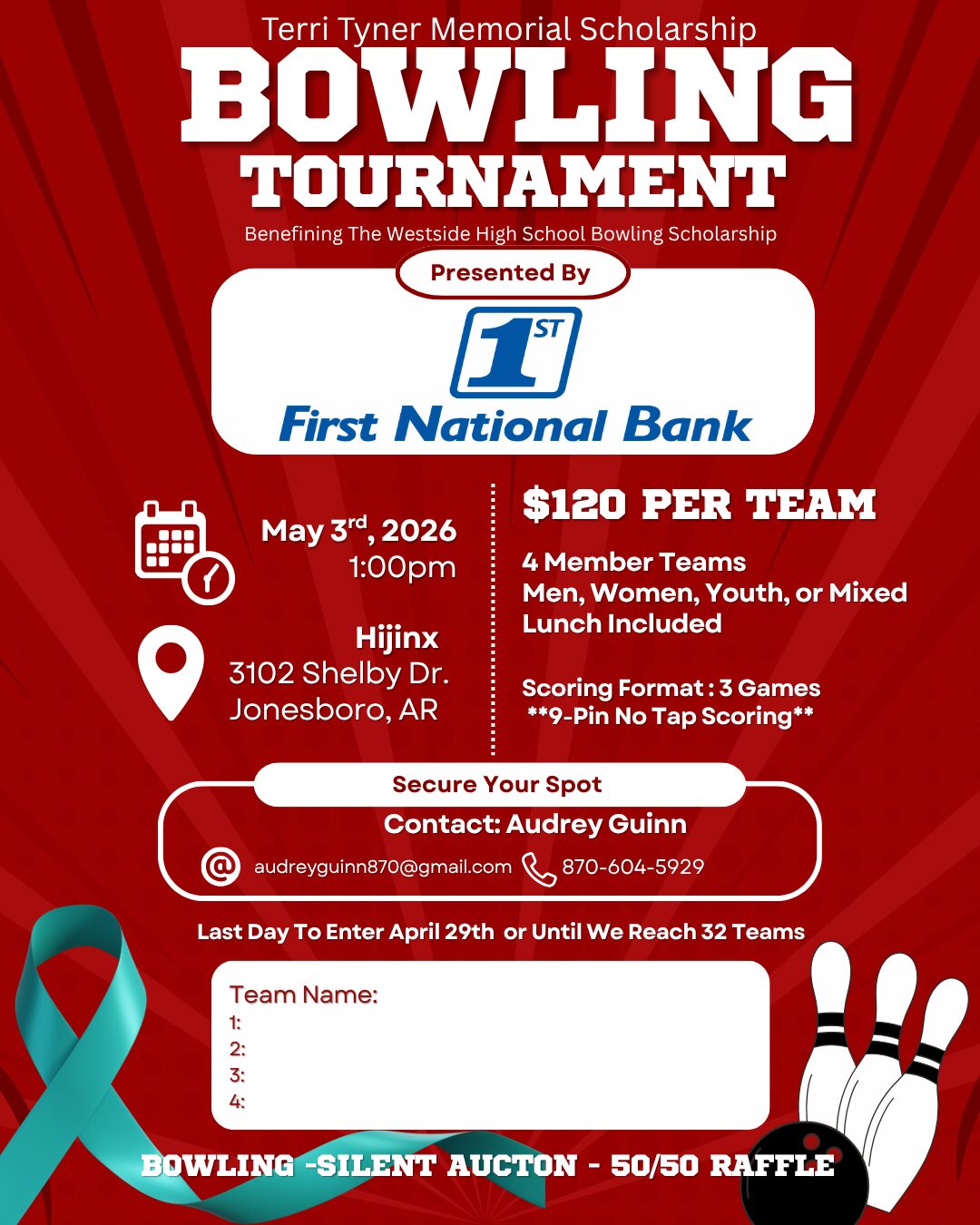 On Sunday, May 3, at 1 p.m., the second Terri Tyner Memorial Scholarship Bowling Tournament will take place, raising funds for a Westside High School bowling scholarship.