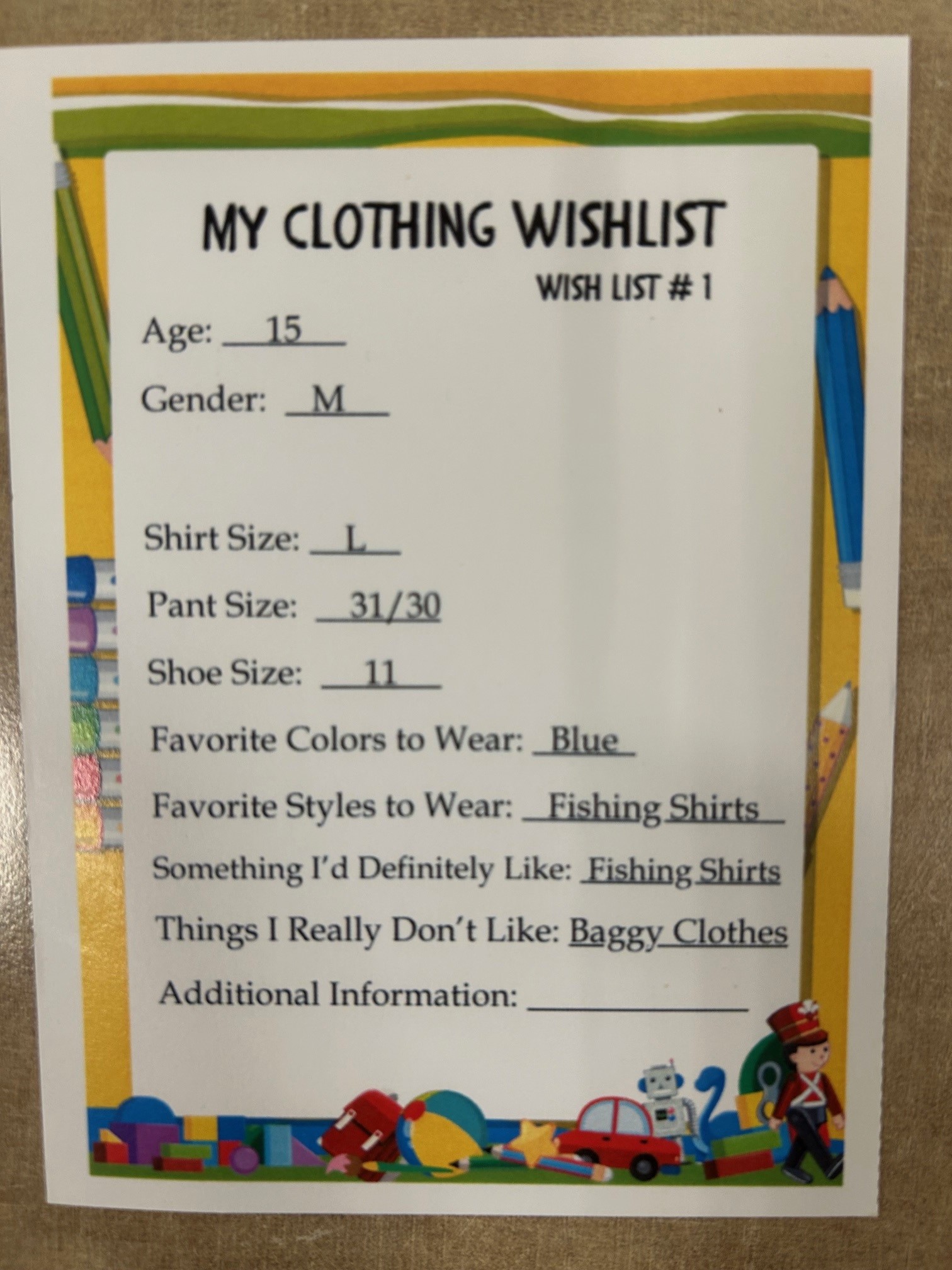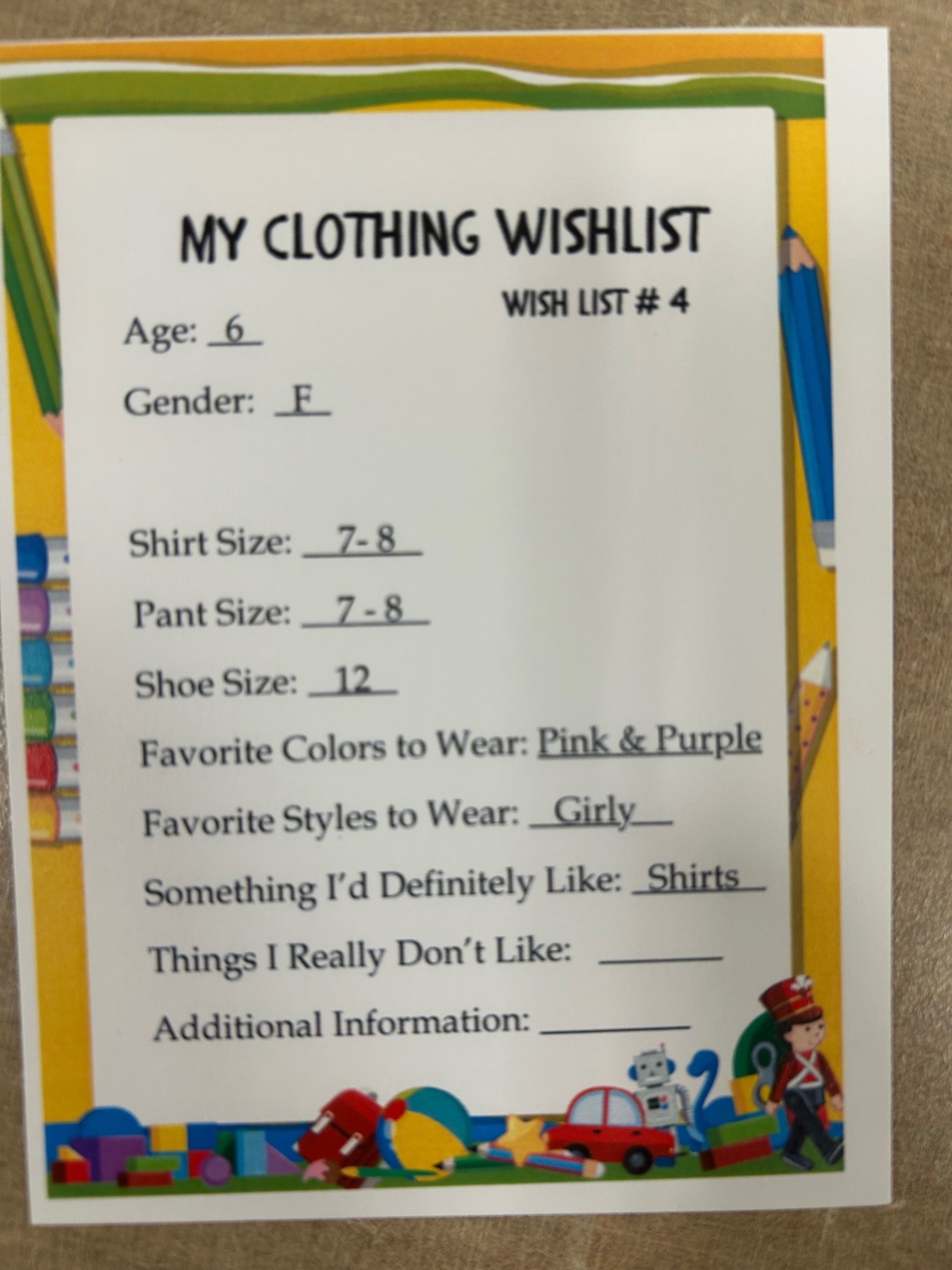 According to Connor, “Our average outfit is around $50.” An outfit includes underwear, socks, pants and a shirt. If shoes are included, the amount is more like $75. Of course, smaller children outfits will cost less while teenagers clothes will be a little more. The age range for wishlists is from 6 months to 19 years old.