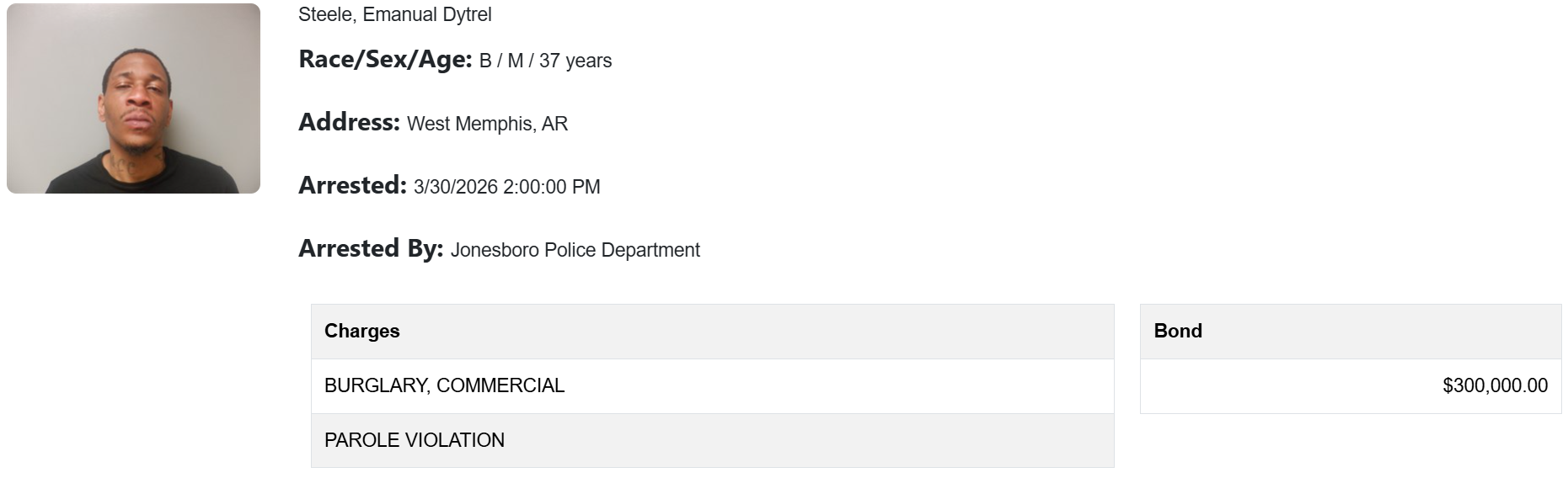 Results received on Feb. 18, 2026, indicated a positive DNA match to 37-year-old Emmanual Dytrel Steele. A detective obtained a phone number for Steele through his probation officer. Despite speaking with Steele multiple times and scheduling several interview appointments, he failed to appear each time.