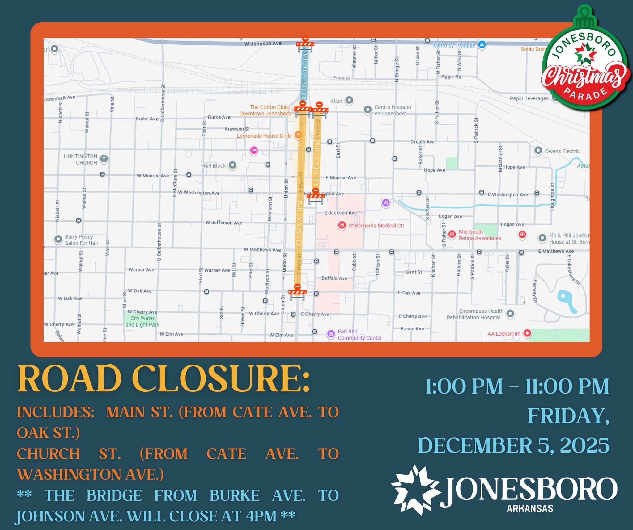 According to a Facebook post from the City of Jonesboro, Main Street from Cate to Oak avenues, and Church Street from Cate to Washington avenues will close on Friday, Dec. 5, for the 78th annual Jonesboro Christmas Parade.