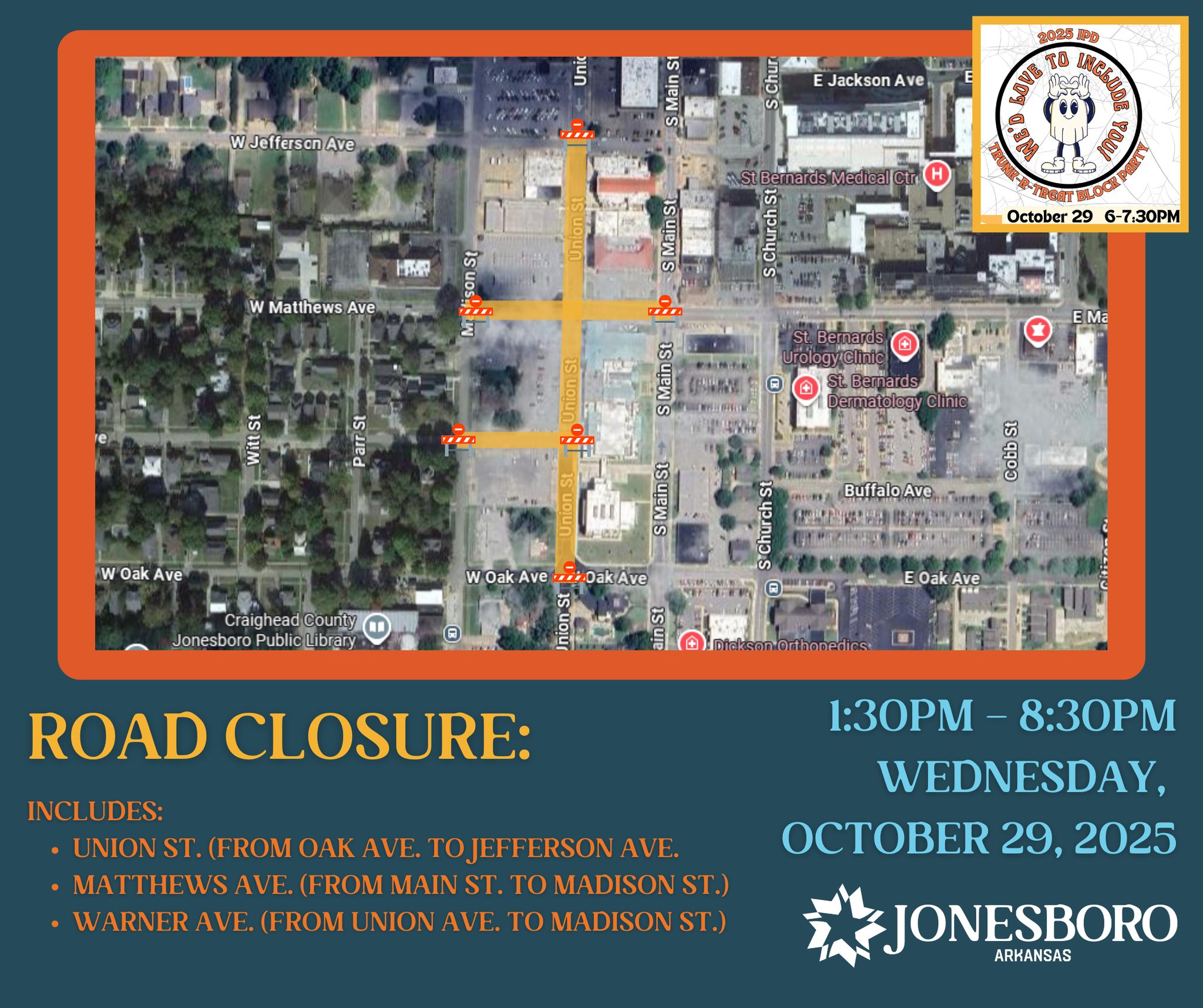 Jonesboro, AR – (JonesboroRightNow.com) – Multiple roads in downtown Jonesboro will be temporarily closed on Wednesday, Oct. 29, for the Jonesboro Police Department’s Trunk or Treat Block Party.