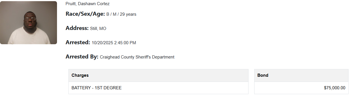 Dashawn Cortez Pruitt, 29, of Steele, MO, appeared before District Judge Tommy Fowler on Oct. 22, who found probable cause to charge him with first-degree battery, a class B felony. Pruitt was arrested after police said he was involved in a fight that occurred Oct. 5.