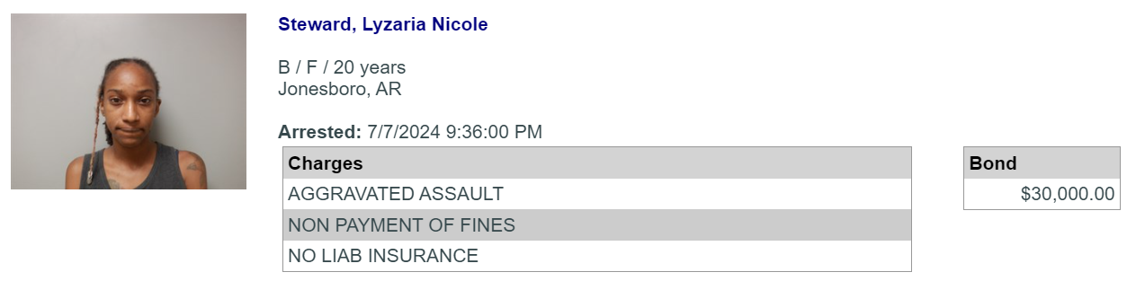 Jonesboro police were called to the Domino’s Pizza on Red Wolf Blvd in reference to a disturbance. An employee told officers that Lyzaria Steward had come into the store, yelling about her pizza order being incorrect. Steward was told by the employee that they would fix the mistake, but she allegedly kept yelling…then cursing, until finally the employee asked her to leave the premises.