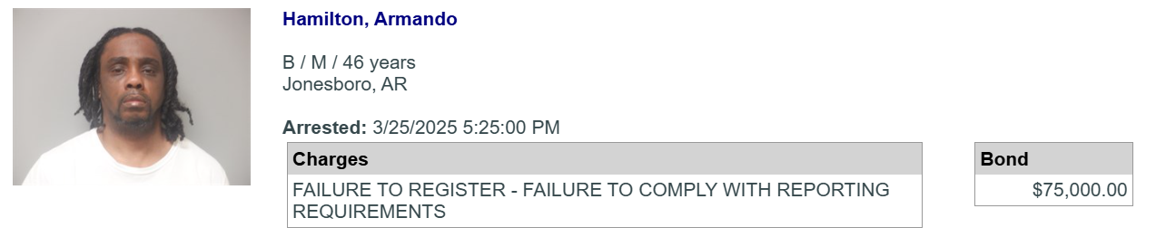 Hamilton failed to appear at that court date, the affidavit said, and he was rearrested on Dec. 31, 2024, for failure to appear. He was released on Feb. 13 and failed to make contact with any jurisdiction in Arkansas to update his reporting requirements, the affidavit said.