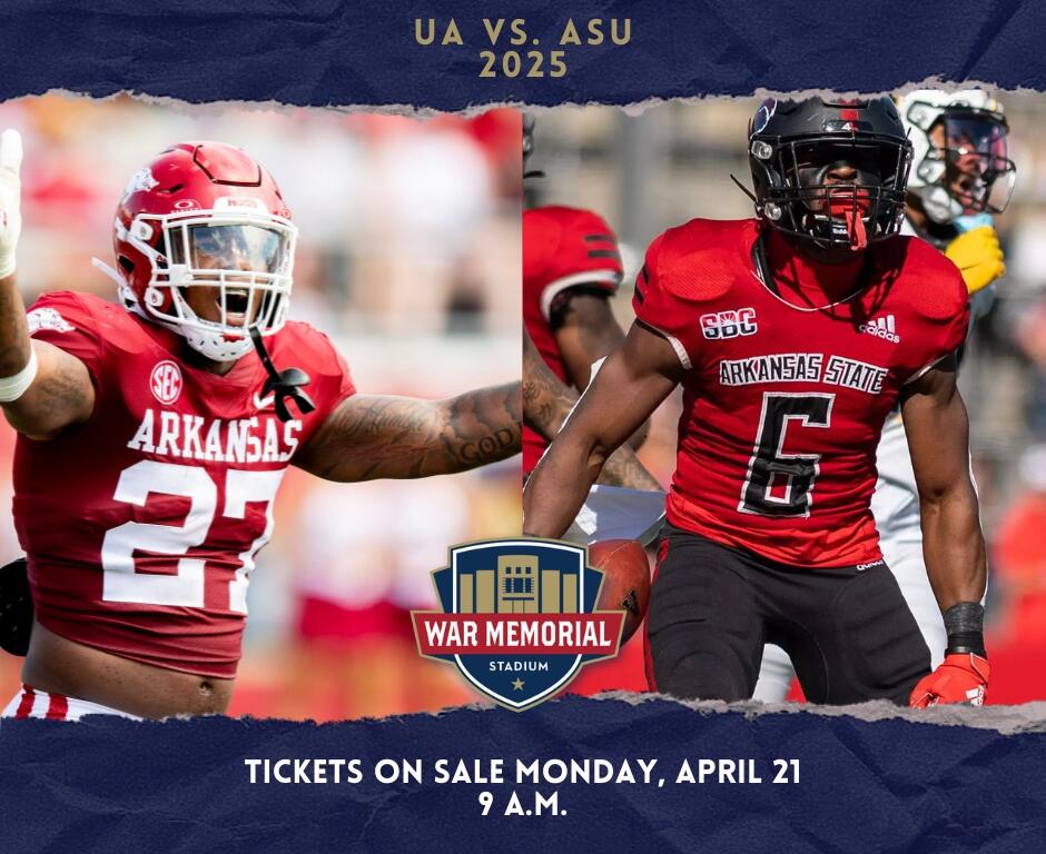 Little Rock, AR — (JonesboroRightNow.com) — April 21, 2025 — Officials with War Memorial Stadium in Little Rock announced Monday that the University of Arkansas has put tickets for the Sept. 6 football game between the Razorbacks and the A-State Red Wolves on sale.