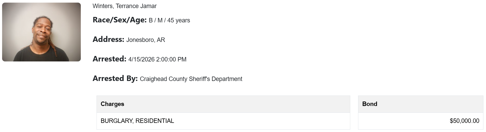 Winters was arrested on April 15, according to the Craighead County Sheriff’s Office jail roster. He appeared before Judge Barbara Halsey two days later, where she found probable cause to charge him with residential burglary (a Class B felony), theft of property greater than $1,000 but less than $5,000 (a Class D felony), and violation of a no-contact order.