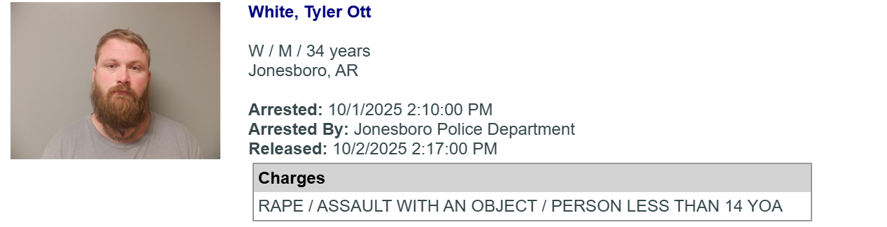 Jonesboro, AR – (JonesboroRightNow.com) – Oct. 3, 2025 – A Jonesboro man facing is facing multiple charges after police said he raped an underage victim.