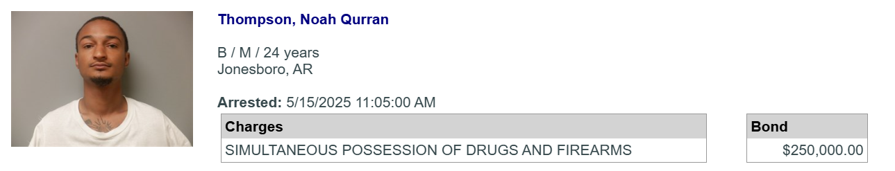 Jonesboro, AR — (JonesboroRightNow.com) — May 16, 2025 — A Jonesboro man was given a $250,000 cash/surety bond on Friday after police said they found several drugs and firearms at his home and evidence of drugs being sold on his phone.