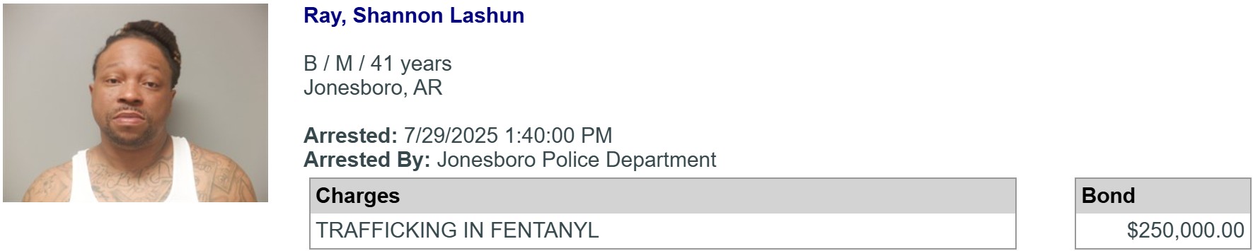 Ray is being held on a $250,000 cash/surety bond in the Craighead County Detention Center. His next court appearance is scheduled for Sept. 30.