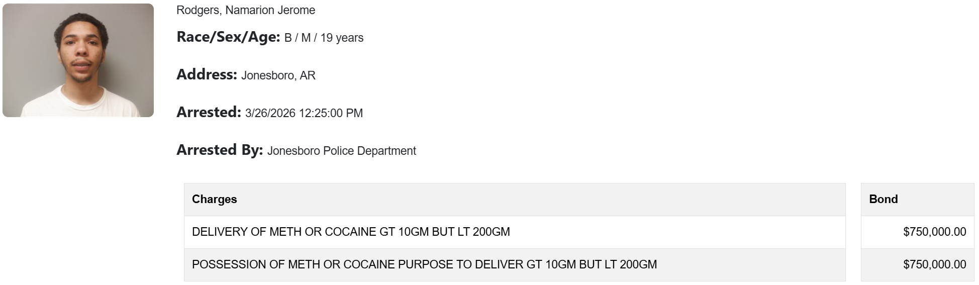 The charges stem from an investigation that began earlier in 2026, when the Second Judicial Drug Task Force received tips that Rodgers was selling “large amounts of cocaine” in the Jonesboro area.
