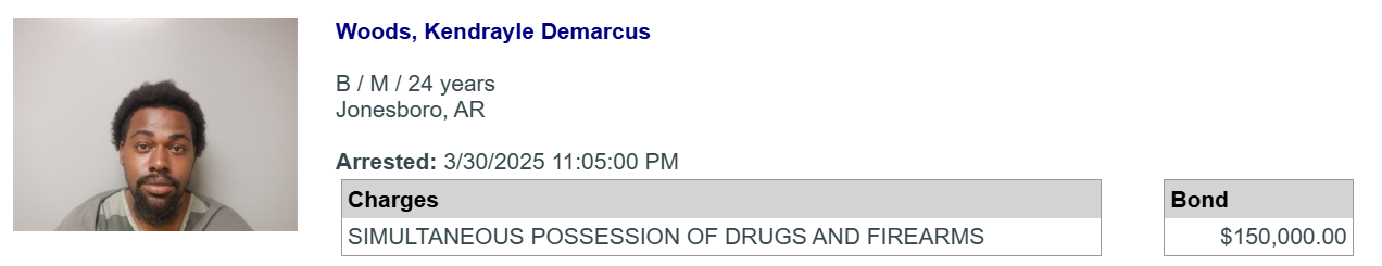 Jonesboro, AR — (JonesboroRightNow.com) — April 2, 2025 — A Jonesboro man is being held on a $150,000 cash/surety bond after police said he was found in possession of marijuana and a loaded firearm.