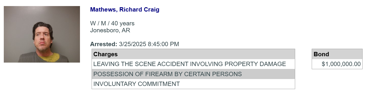 According to the probable cause affidavit, on March 25, Jonesboro police were dispatched to the area of 1700 Caraway Road regarding a man swinging a sword at cars. Officers later located the man, later identified as Matthews, in a nearby parking lot.