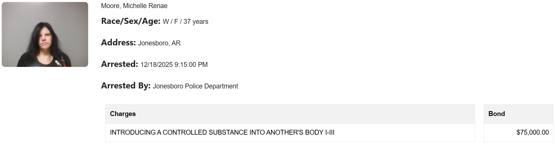 District Judge Tommy Fowler found probable cause Dec. 19 to charge 37-year-old Michelle Renae Moore with introducing a controlled substance into another’s body (Schedule I-III) and first-degree endangering the welfare of a minor. The charges come after a report was filed with Jonesboro police Nov. 21 on Moore’s three-month-old baby who tested positive for meth and cocaine.