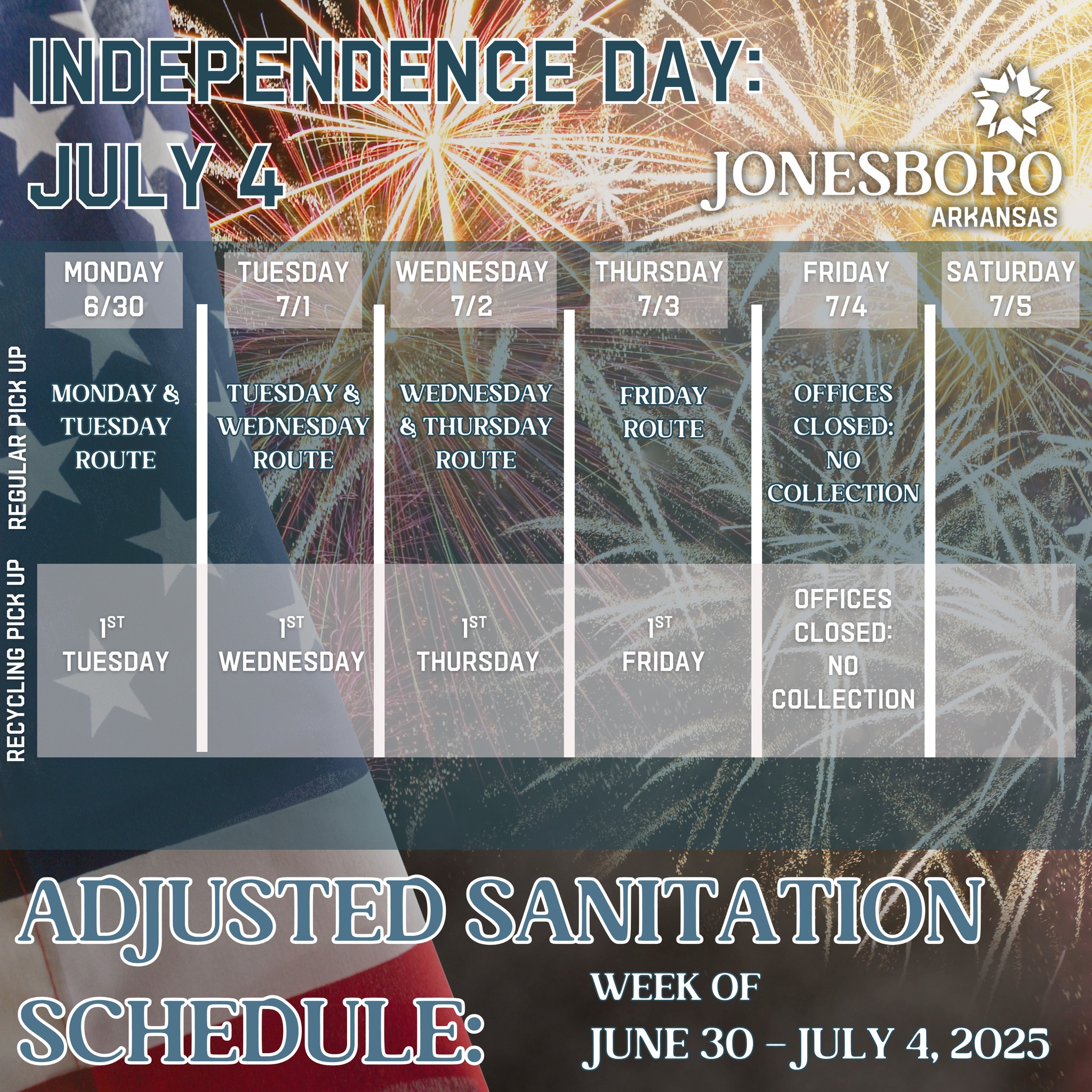 Jonesboro, AR — (JonesboroRightNow.com) — June 24, 2025 — In preparation for the Independence Day holiday, Jonesboro Sanitation Department workers are running double routes next week.