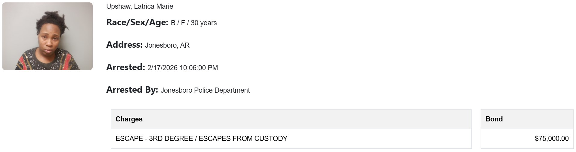 At roughly 9:13 p.m. on Feb. 17, a Jonesboro police officer pulled over a van driven by 30-year-old Latricia Marie Upshaw as she turned into a driveway on Center Street. According to the probable cause affidavit, the officer noticed physical signs of impairment, including bloodshot, watery eyes, and a strong odor of alcohol.