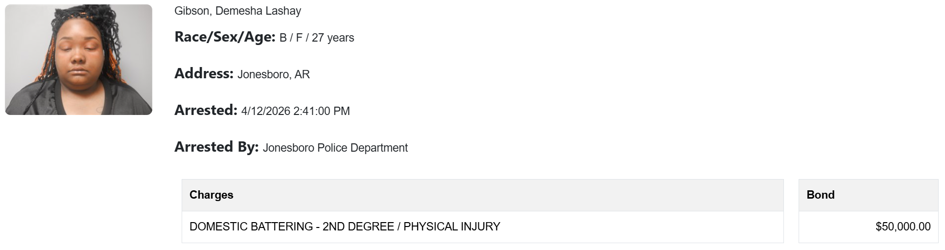 On April 12, Jonesboro police responded to a domestic disturbance and found a man lying on the sidewalk with a stab wound to his neck. He was taken to a hospital for treatment, while 27-year-old Demesha Lashay Gibson was detained at the scene.