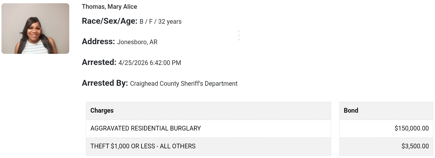 Thomas was arrested on April 25, according to the Craighead County Sheriff’s Office jail roster. She appeared the following Monday in front of District Judge Tommy Fowler. He found probable cause to charge her with aggravated residential burglary (Class Y felony) and third-degree battery/purpose of causing injury (Class A misdemeanor).
