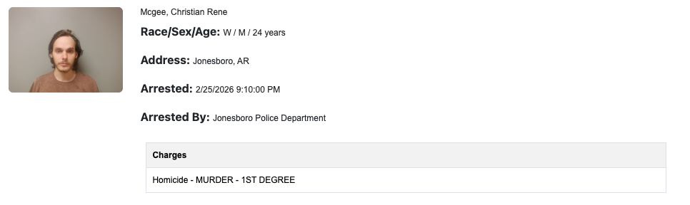 According to Sally Smith, public information official for the JPD, Christian Rene McGee, 24, was arrested for the shooting death of 23-year-old Robert Larson.