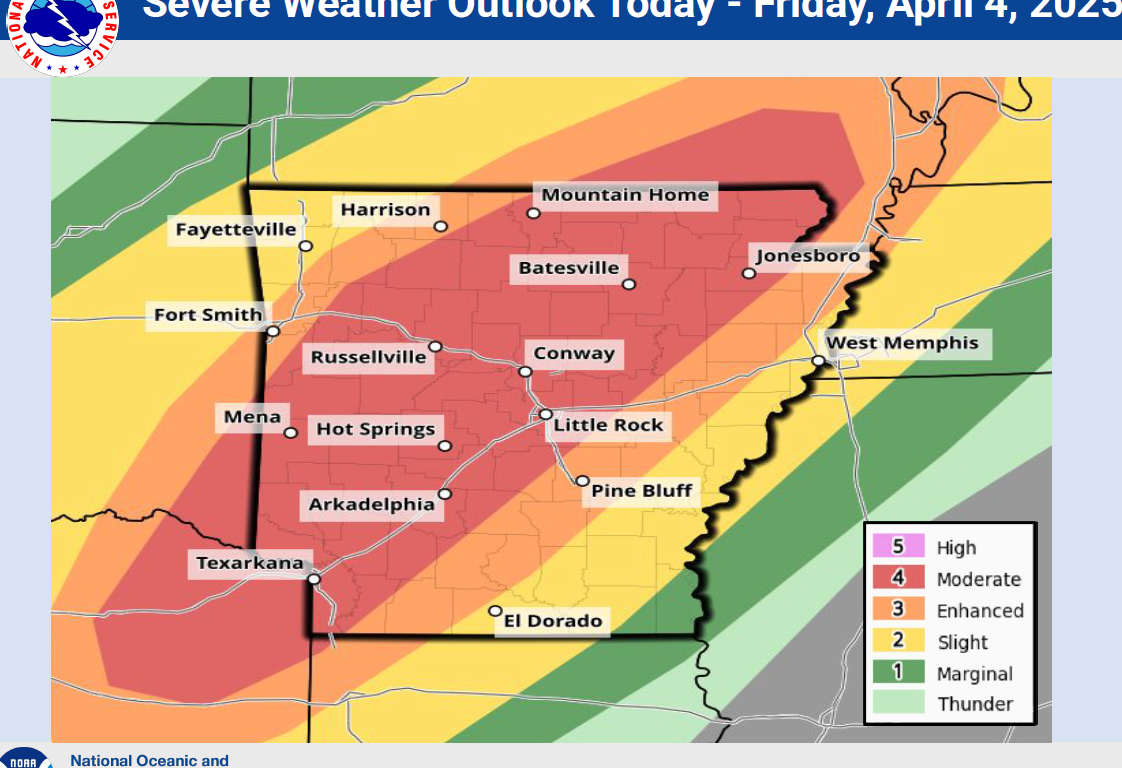 The National Weather Service Storm Prediction Center has put Northeast Arkansas in a level 4 out of 5 moderate risk area for severe weather today. A cold front that moved through the area after the storms Wednesday night will move back to the North as a warm front today. Temperatures will rise from the 50s this morning to the 70s and 80s by this afternoon putting the area at a higher risk for severe thunderstorms with damaging winds, large hail and the possibility of tornadoes.