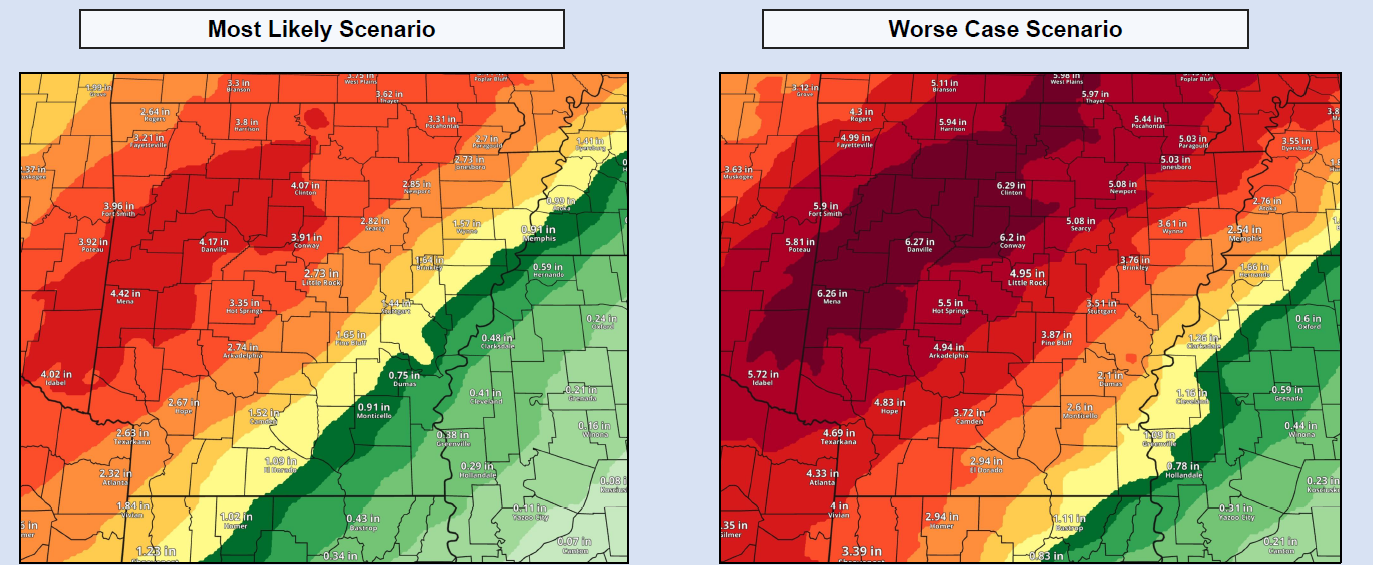 In addition, a PDS (Particularly Dangerous Situation) Flood Watch remains in effect through late Saturday night for additional flooding rains expected across the area. As of 7am this morning 2.92 inches of rain had fallen this week at the Jonesboro Municipal Airport, the location of the FAA automated weather observation station. An addition 3 to 5 inches is likely across the area, which would bring the week’s total rainfall to 6 to 8 inches. Higher amounts of rain have been recorded North of the area across South Missouri, and South of the area along the Interstate 40 corridor.