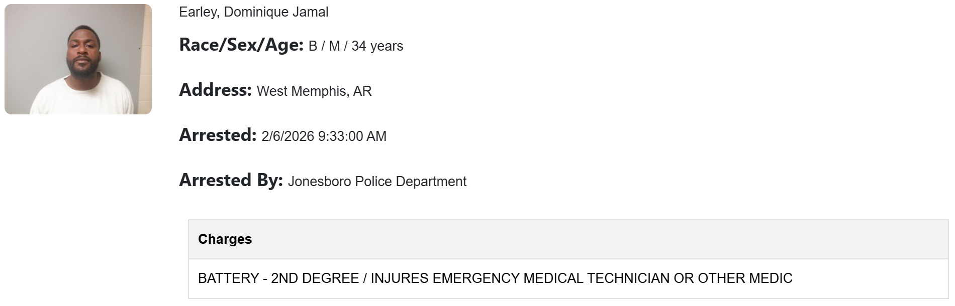 According to a probable cause affidavit, on Feb. 6, Jonesboro police officers responded to the 2700 block of East Johnson Avenue for a disturbance in progress. Upon arrival, staff members restrained 34-year-old Dominique Jamal Earley, of West Memphis, AR, after attacking one of them.