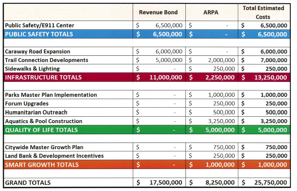 The highlights of the projects proposed in the plan include $6,500,000 for a public safety/E911 center to be built on newly acquired property next to the present Police Station on Caraway Road; $6,000,000 to expand Caraway Road South to Fox Meadow; $7,000,000 for trail connection developments; $250,000 for sidewalks and lighting; $1,000,000 for a parks master plan implementation; $250,000 in Forum upgrades; $500,000 in humanitarian outreach; $3,250,000 in additional aquatics and pool construction; $750,000 for a citywide master growth plan; and $250,000 for land bank and development incentives.