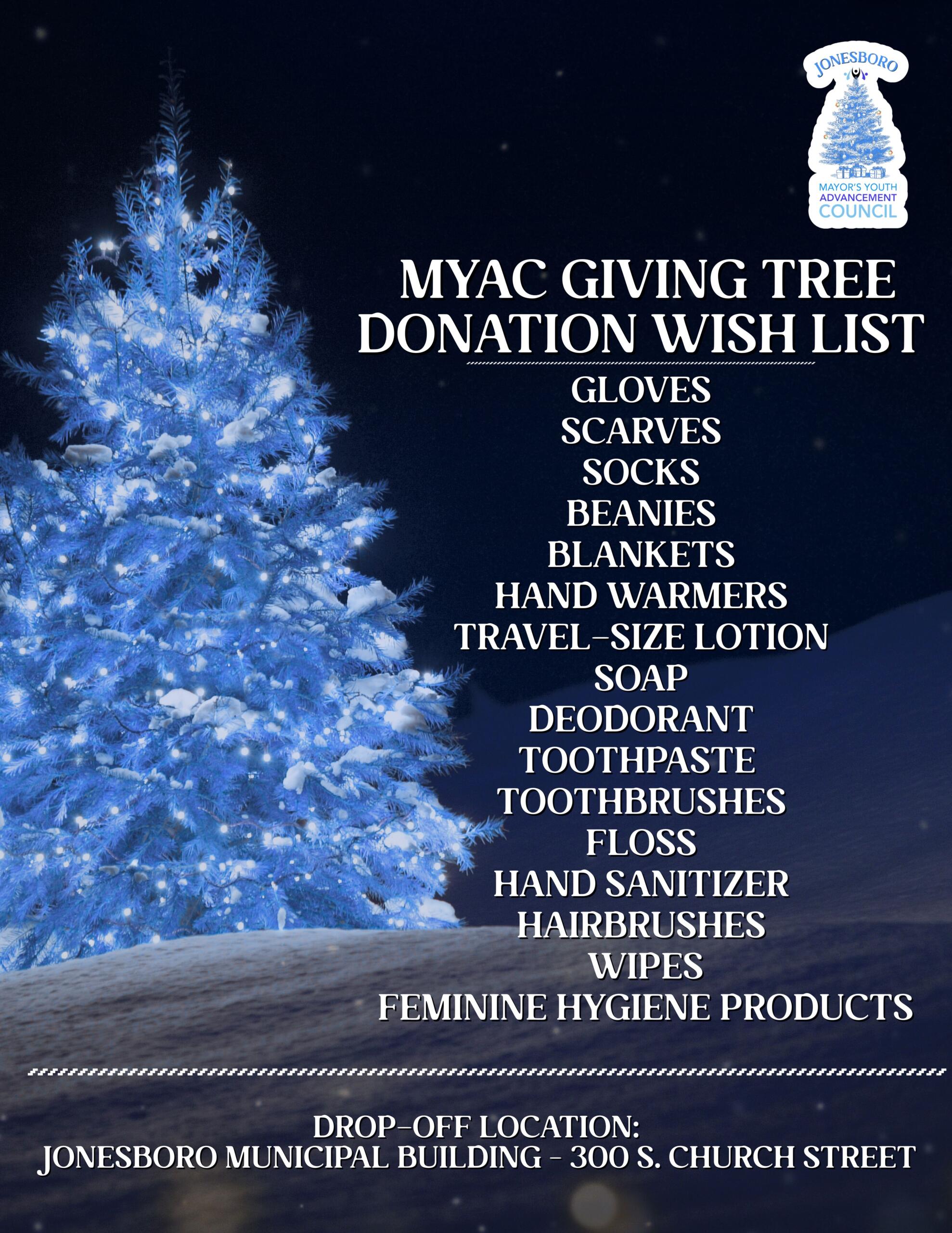Jonesboro, AR – (JonesboroRightNow.com) – The Mayor’s Youth Advancement Council (MYAC) is now accepting donations for its second annual Giving Tree, as well as its new Traveling Giving Tree.