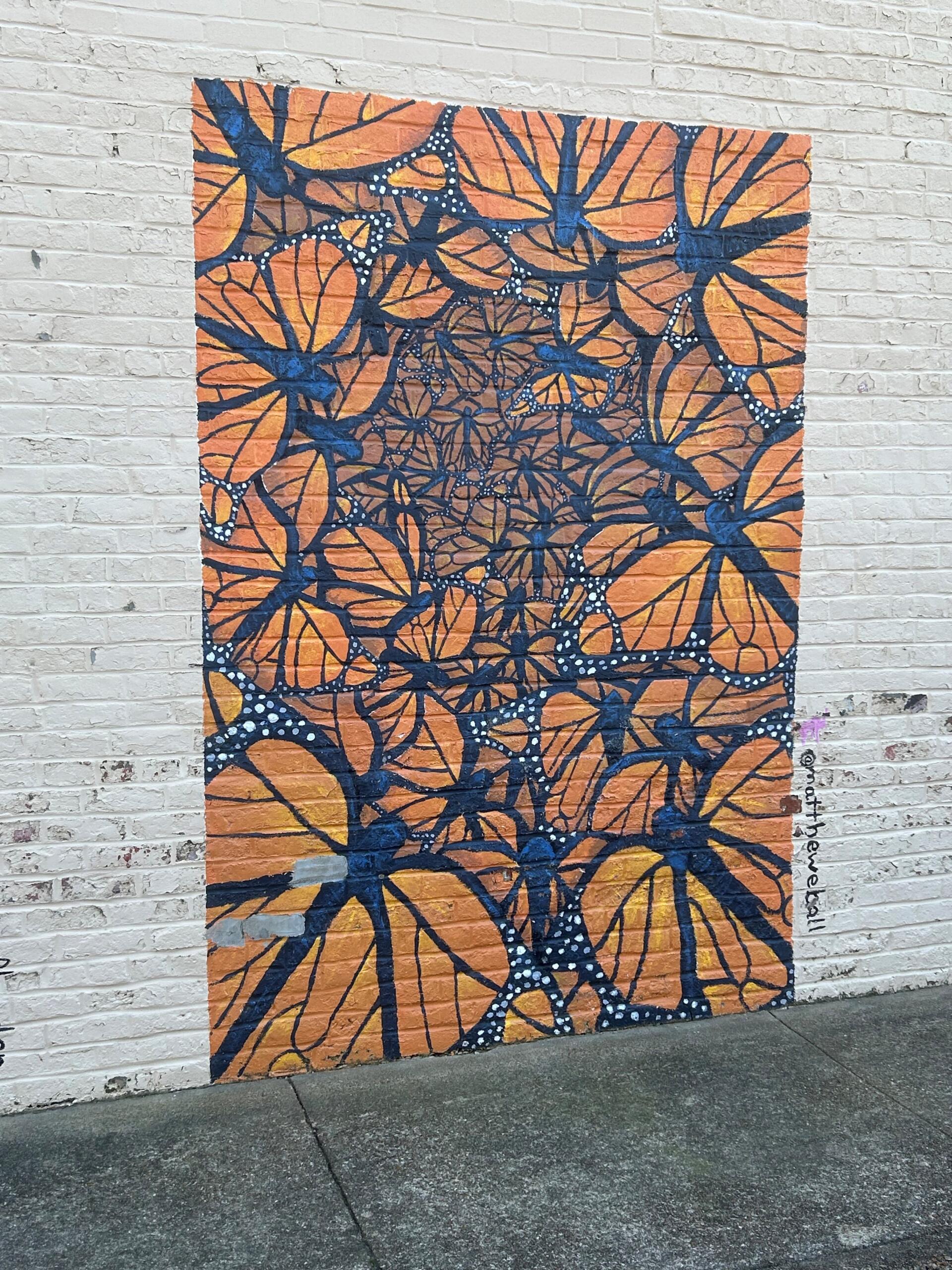 Next time you’re at the corner of Main and Washington, look over at one of the newest paintings designed to beautify the city… a “flight” of brilliant blue butterflies created by Matt Ball. He’s a local artist that was commissioned to continue his butterfly motif in the downtown area. Ball was also chosen to paint monarch butterflies on the Selfie Wall on Monroe Avenue, a project that began in 2020.